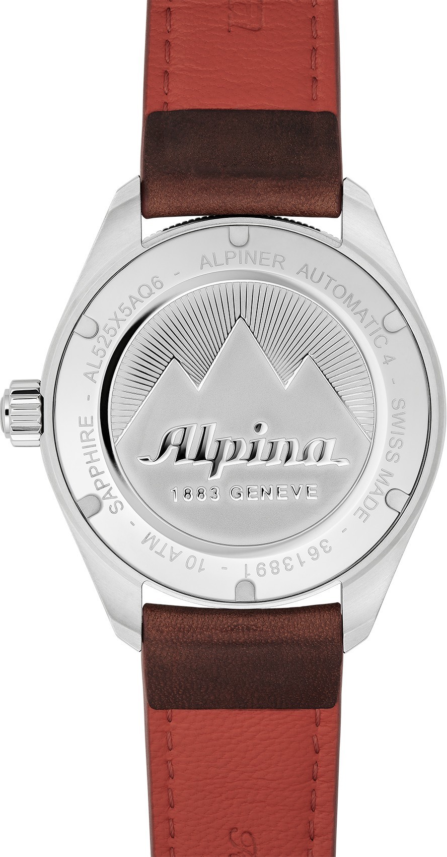 Alpina Alpiner 4 Automatic AL-525G5AQ6 sú pánske automatické hodinky na hnedom koženom remienku s kontrastným prešívaním a tŕňovou sponou. Puzdro z nerezovej ocele má priemer 44 milimetrov, signovanú skrutkovaciu korunku a obojsmerne otočnú lunetu s minútovou stupnicou. Šedý číselník s horizontálnou textúrou, efektom slnečného brusu a ukazovateľom dátumu na tretej hodine je chránený odolným zafírovým sklom s antireflexnou vrstvou. Protiváhou centrálnej sekundovej ručičky je červený trojuholník - logo Alpiny symbolizujúce alpské vrcholy. Ručičky a indexy disponujú luminiscenčným náterom Super-LumiNova®, ktorý garantuje perfektnú čitateľnosť za zhoršených svetelných podmienok. Pohon hodiniek zaisťuje mechanický stroj AL-525 (základom je strojček SW200) s automatickým náťahom a rezervou chodu 38 hodín. S vodotesnosťou 10 ATM sú hodinky vhodné na plávanie a šnorchlovanie.