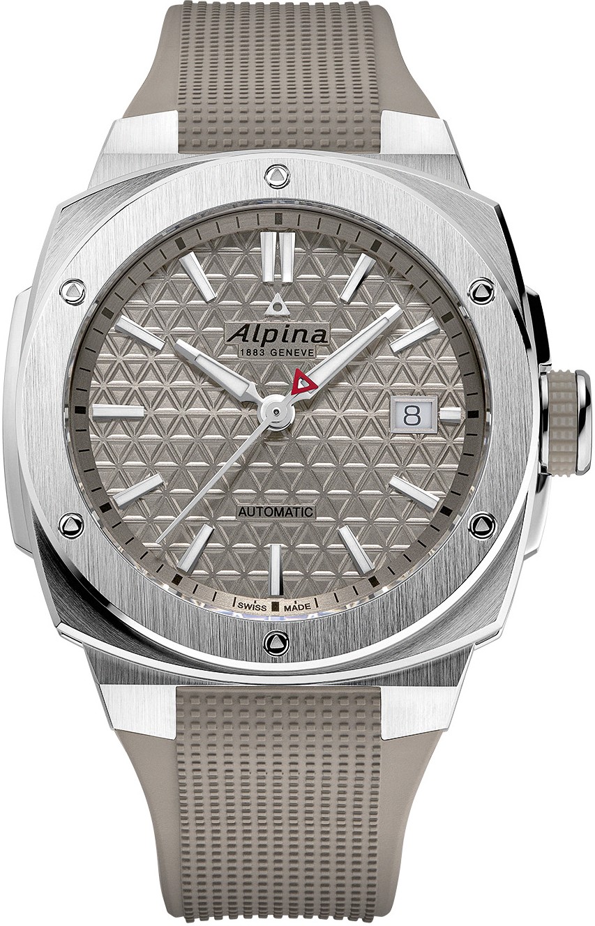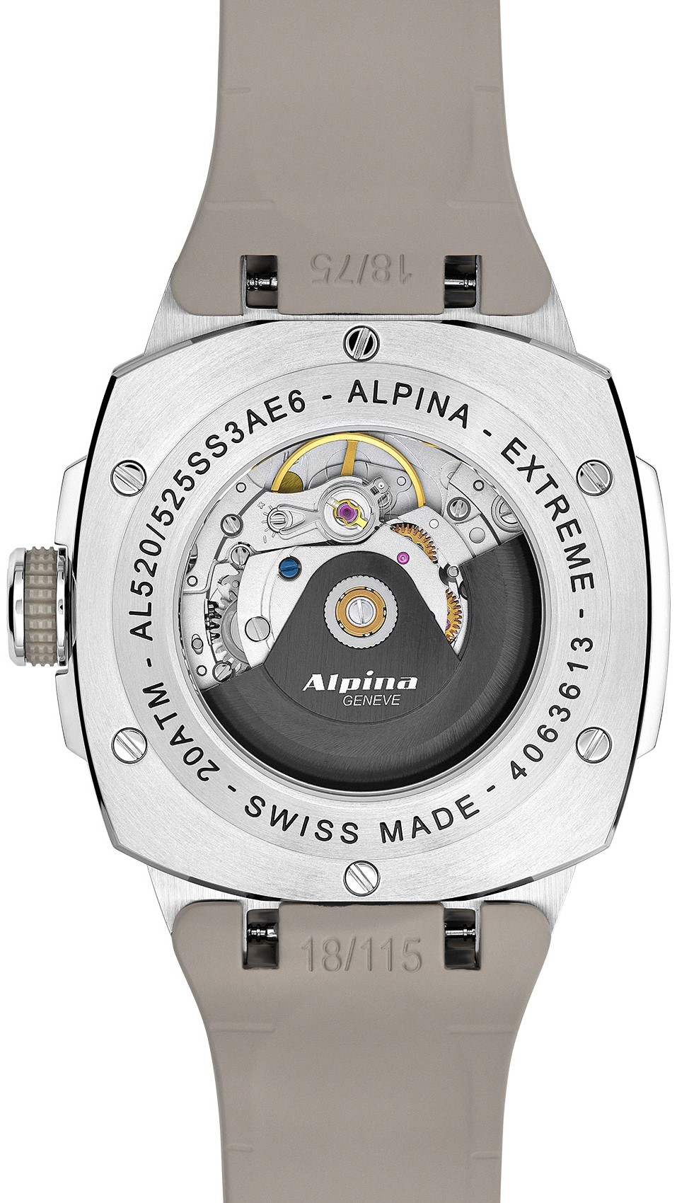 Alpina Alpiner Extreme Automatic AL-525BG3AE6 sú pánske automatické hodinky na béžovom kaučukovom remienku s preklápacou sponou. Hranaté puzdro z nerezovej ocele široké 39 milimetrov má priehľadné viečko a signovanú skrutkovaciu korunku. Béžový číselník s trojuholníkovým vzorom, efektom slnečného brusu a ukazovateľom dátumu na tretej hodine je chránený odolným zafírovým sklom. Protiváhou centrálnej sekundovej ručičky je červený trojuholník - logo Alpiny symbolizujúce alpské vrcholy. Ručičky a indexy disponujú luminiscenčným náterom Super-LumiNova®, ktorý garantuje perfektnú čitateľnosť za zhoršených svetelných podmienok. Pohon hodiniek zaisťuje mechanický strojček AL-525 (základom je strojček SW200) s automatickým náťahom a rezervou chodu 38 hodín. S vodotesnosťou 20 ATM sú hodinky vhodné na hlbinné potápanie.