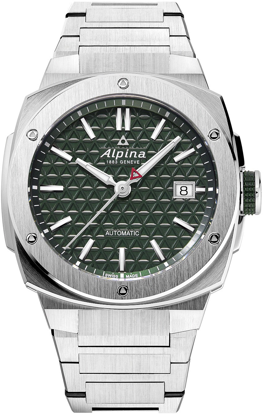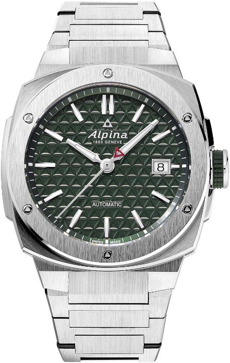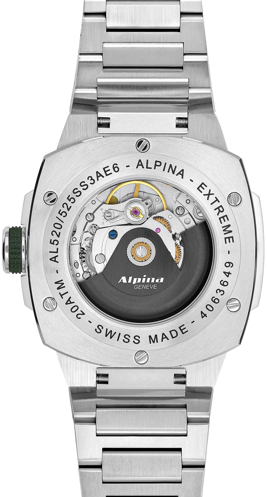 Alpina Alpiner Extreme Automatic AL-525GR3AE6B sú pánske automatické hodinky v klasickom štýle na oceľovom náramku s brúsenou povrchovou úpravou a motýlikovou sponou. Hranaté puzdro z nerezovej ocele široké 39 milimetrov má priehľadné viečko a signovanú skrutkovaciu korunku. Zelený číselník s trojuholníkovým vzorom a ukazovateľom dátumu na tretej hodine je chránený odolným zafírovým sklom. Protiváhou centrálnej sekundovej ručičky je červený trojuholník - logo Alpiny symbolizujúce alpské vrcholy. Ručičky a indexy disponujú luminiscenčným náterom Super-LumiNova®, ktorý garantuje perfektnú čitateľnosť za zhoršených svetelných podmienok. Pohon hodiniek zaisťuje mechanický strojček AL-525 (základom je strojček SW200) s automatickým náťahom a rezervou chodu 38 hodín. S vodotesnosťou 20 ATM sú hodinky vhodné na hlbinné potápanie.