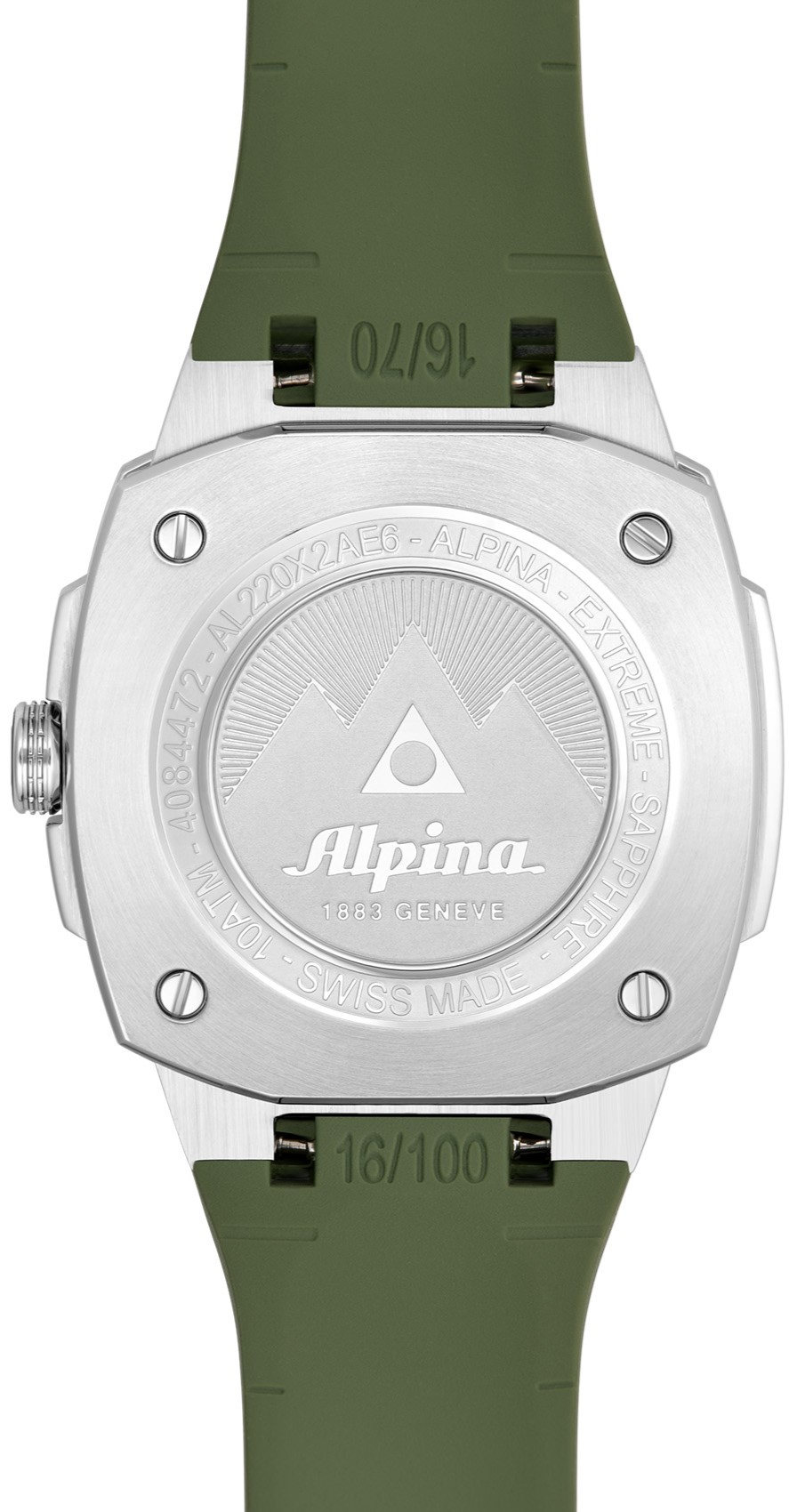 Alpina Alpiner Extreme Quartz AL-220K2AE6 sú dámske batériové hodinky na zelenom kaučukovom remienku s tŕňovou sponou. Hranaté puzdro z nerezovej ocele širokej 34 milimetrov má signovanú korunku. Zelený číselník s trojuholníkovým vzorom, efektom slnečného brusu a ukazovateľom dátumu na šiestej hodine je chránený odolným zafírovým sklom s antireflexnou vrstvou. Protiváhou centrálnej sekundovej ručičky je červený trojuholník - logo Alpiny symbolizujúce alpské vrcholy. Ručičky a indexy disponujú luminiscenčným náterom Super-LumiNova®, ktorý garantuje perfektnú čitateľnosť za zhoršených svetelných podmienok. Pohon hodiniek zaisťuje spoľahlivý quartzový strojček AL-220 (základom je strojček Ronda 505). S vodotesnosťou 10 ATM sú hodinky vhodné na plávanie a šnorchlovanie.