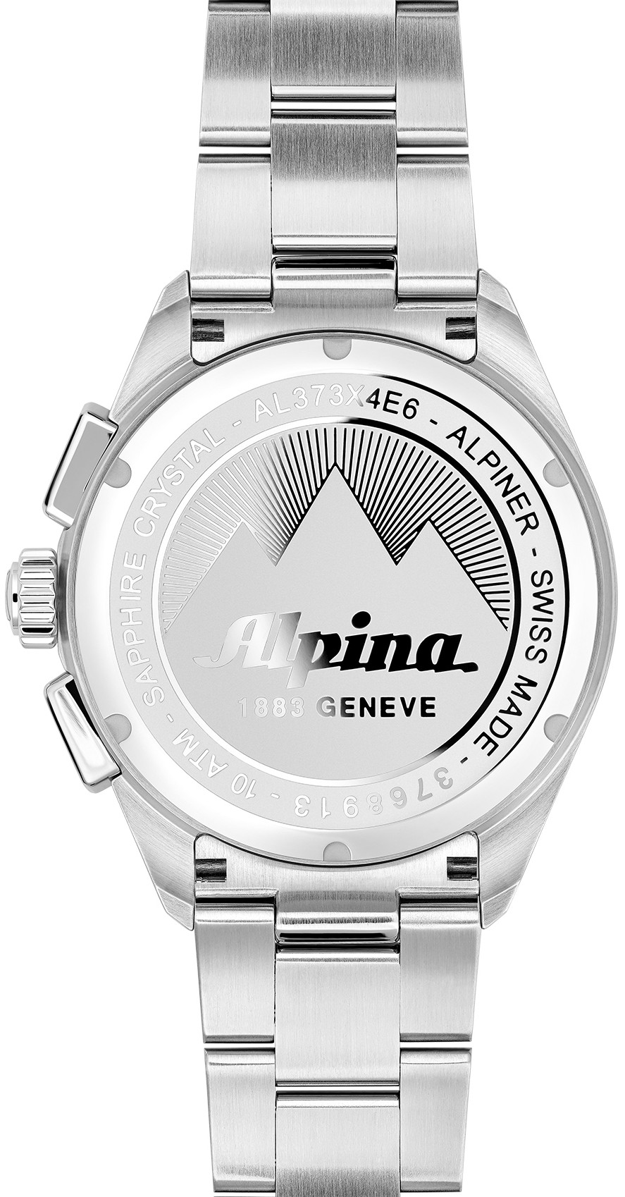 Alpina Alpiner Quartz Chronograph AL-373BS4E6B sú pánske športové batériové hodinky na oceľovom náramku v kombinácii brúsu a lesku s motýlikovou sponou. Puzdro z nerezovej ocele má priemer 42 milimetrov a signovanú korunku. Čierny číselník s ukazovateľom dátumu a stopkami je chránený odolným zafírovým sklom. Protiváhou centrálnej ručičky chronografu je červený trojuholník - logo Alpiny symbolizujúce alpské vrcholy. Ručičky a indexy disponujú luminiscenčným náterom Super-LumiNova®, ktorý garantuje perfektnú čitateľnosť za zhoršených svetelných podmienok. Pohon hodiniek zaisťuje spoľahlivý quartzový strojček AL-373 (základom je strojček Ronda 5030.D). S vodotesnosťou 10 ATM sú hodinky vhodné na plávanie a šnorchlovanie.