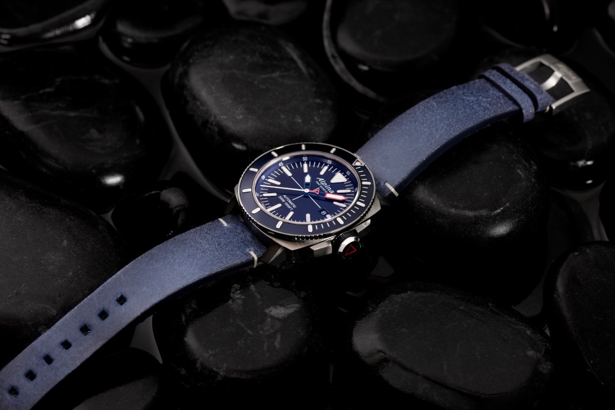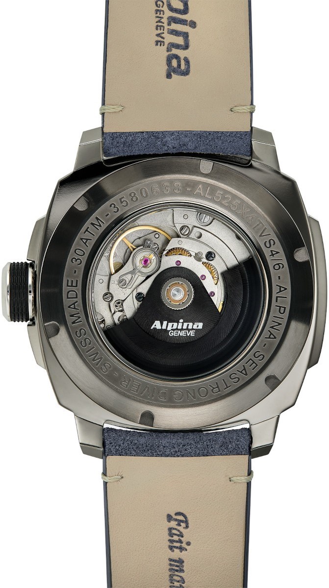 Alpina Seastrong Diver 300 AL-525LNN4TV6 sú pánske potápačské automatické hodinky na modrom koženom remienku s tŕňovou sponou. Puzdro z nerezovej ocele s povrchovou PVD úpravou šedej farby má priemer 44 milimetrov, jednosmerne otočnú lunetu, priehľadné viečko a signovanú skrutkovaciu korunku. Tmavomodrý číselník s ukazovateľom dátumu na tretej hodine je chránený odolným zafírovým sklom. Protiváhou centrálnej sekundovej ručičky je červený trojuholník - logo Alpiny symbolizujúce alpské vrcholy. Ručičky a indexy disponujú luminiscenčným náterom Super-LumiNova®, ktorý garantuje perfektnú čitateľnosť za zhoršených svetelných podmienok. Pohon hodiniek zaisťuje spoľahlivý mechanický strojček AL-525 automatickým náťahom a rezervou chodu 38 hodín. S vodotesnosťou 30 ATM sú hodinky vhodné na prístrojové potápanie. Súčasťou balenia je náhradný remienok z kaučuku v modrej farbe.