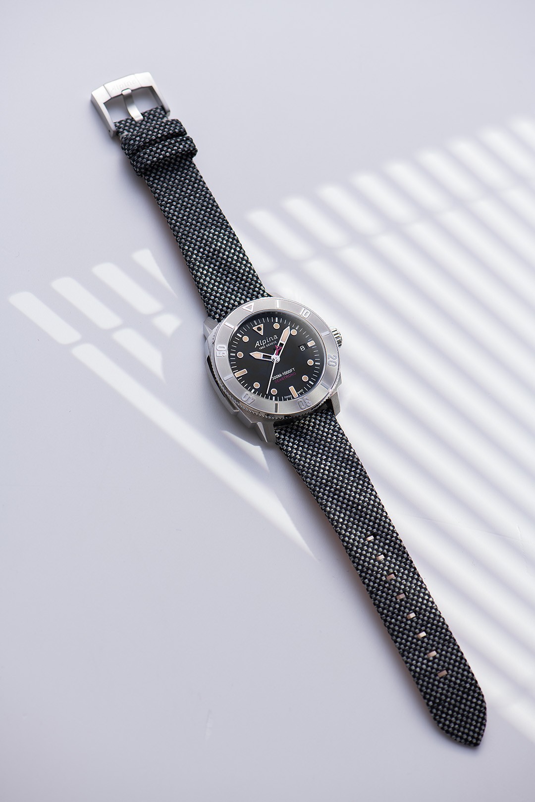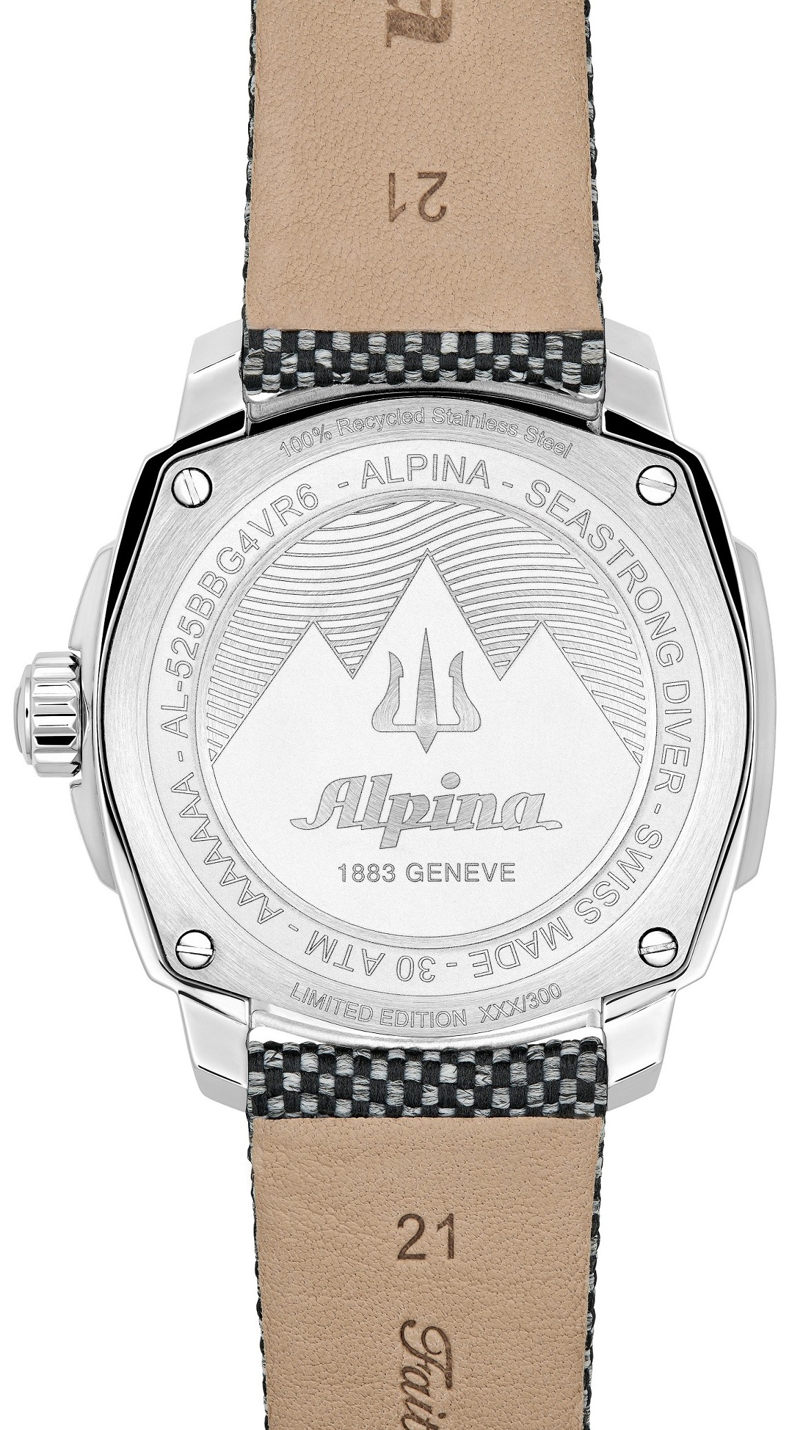 Alpina Seastrong Diver 300 Automatic Calanda AL-525BBG4VR6 sú pánske potápačské automatické hodinky na šedom textilnom remienku vyrobenom z recyklovaných PET fliaš s tŕňovou sponou. Puzdro z nerezovej ocele má priemer 42 milimetrov, jednosmerne otočnú lunetu a signovanú skrutkovaciu korunku. Čierny číselník s ukazovateľom dátumu na tretej hodine je chránený odolným zafírovým sklom. Protiváhou centrálnej sekundovej ručičky je červený trojuholník - logo Alpiny symbolizujúce alpské vrcholy. Ručičky a indexy disponujú luminiscenčným náterom Super-LumiNova®, ktorý garantuje perfektnú čitateľnosť za zhoršených svetelných podmienok. Pohon hodiniek zaisťuje spoľahlivý mechanický strojček AL-525 automatickým náťahom a rezervou chodu 38 hodín. S vodotesnosťou 30 ATM sú hodinky vhodné na prístrojové potápanie.