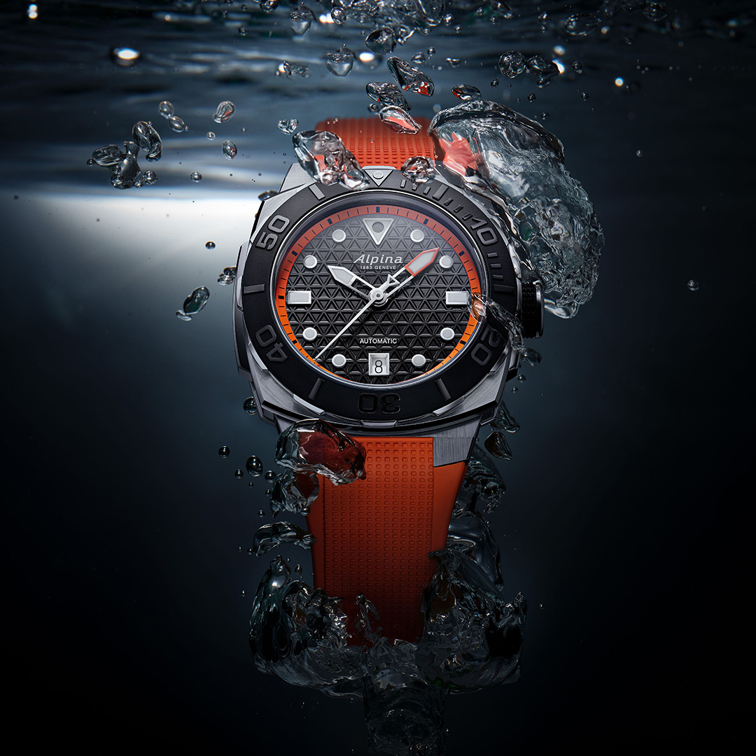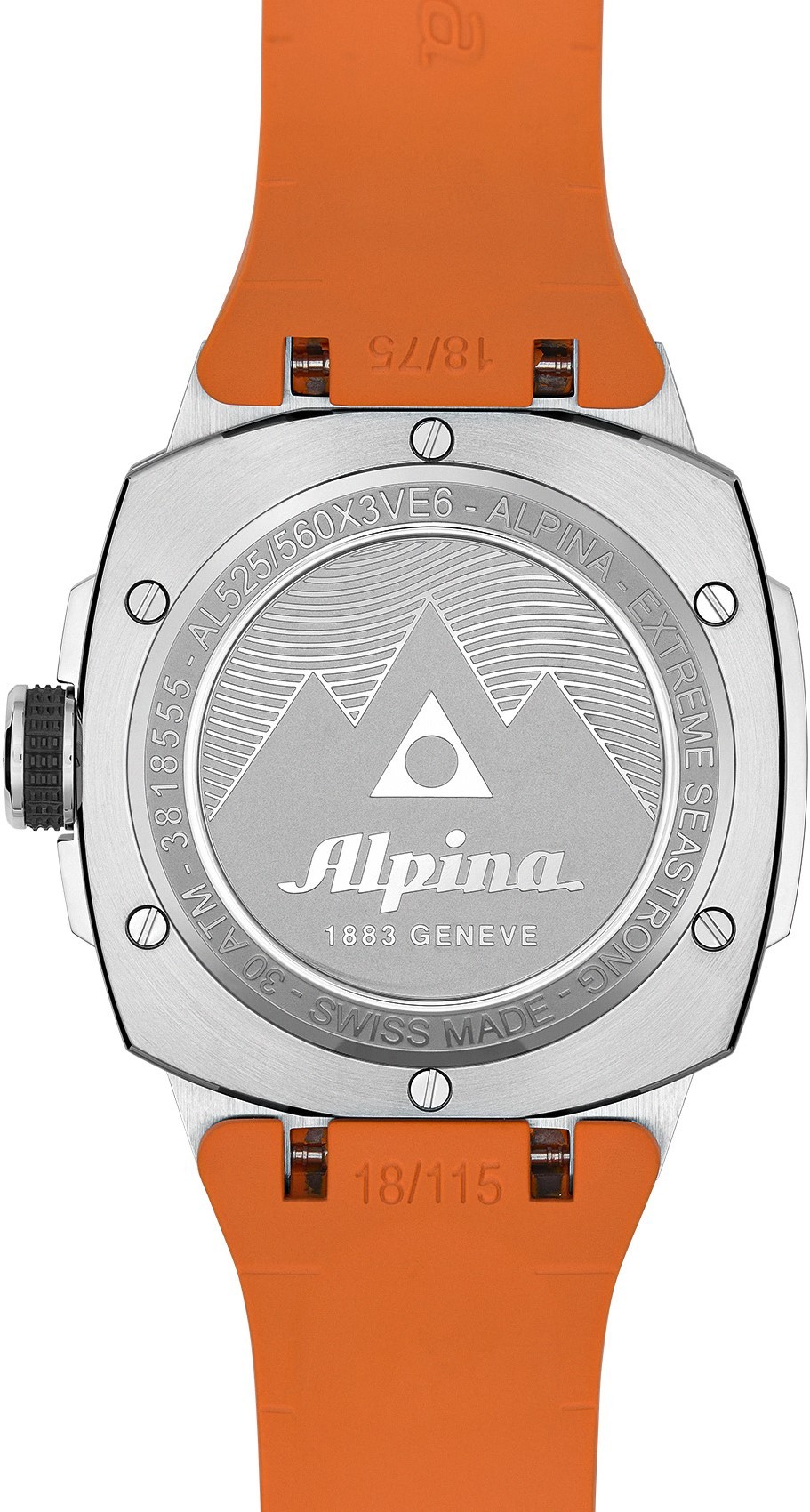 Alpina Seastrong Diver Extreme Automatic AL-525BO3VE6 sú pánske potápačské automatické hodinky na oranžovom kaučukovom remienku s preklápacou sponou. Puzdro z nerezovej ocele má priemer 39 milimetrov, jednosmerne otočnú lunetu a signovanú skrutkovaciu korunku. Čierny číselník s trojuholníkovým vzorom a ukazovateľom dátumu na šiestej hodine je chránený odolným zafírovým sklom s antireflexnou vrstvou. Ručičky a indexy disponujú luminiscenčným náterom Super-LumiNova®, ktorý garantuje perfektnú čitateľnosť za zhoršených svetelných podmienok. Pohon hodiniek zaisťuje spoľahlivý mechanický strojček AL-525 automatickým náťahom a rezervou chodu 38 hodín. S vodotesnosťou 30 ATM sú hodinky vhodné na prístrojové potápanie.