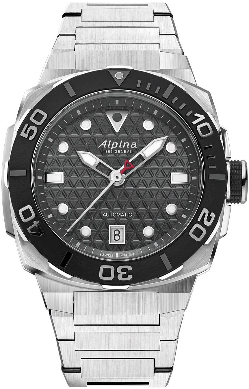 Alpina Seastrong Diver Extreme Automatic AL-525G3VE6B sú pánske potápačské automatické hodinky na oceľovom náramku s motýlikovou sponou. Puzdro z nerezovej ocele má priemer 39 milimetrov, jednosmerne otočnú lunetu a signovanú skrutkovaciu korunku. Antracitový číselník s trojuholníkovým vzorom a ukazovateľom dátumu na šiestej hodine je chránený odolným zafírovým sklom s antireflexnou vrstvou. Protiváhou centrálnej sekundovej ručičky je červený trojuholník - logo Alpiny symbolizujúce alpské vrcholy. Ručičky a indexy disponujú luminiscenčným náterom Super-LumiNova®, ktorý garantuje perfektnú čitateľnosť za zhoršených svetelných podmienok. Pohon hodiniek zaisťuje spoľahlivý mechanický strojček AL-525 automatickým náťahom a rezervou chodu 38 hodín. S vodotesnosťou 30 ATM sú hodinky vhodné na prístrojové potápanie.