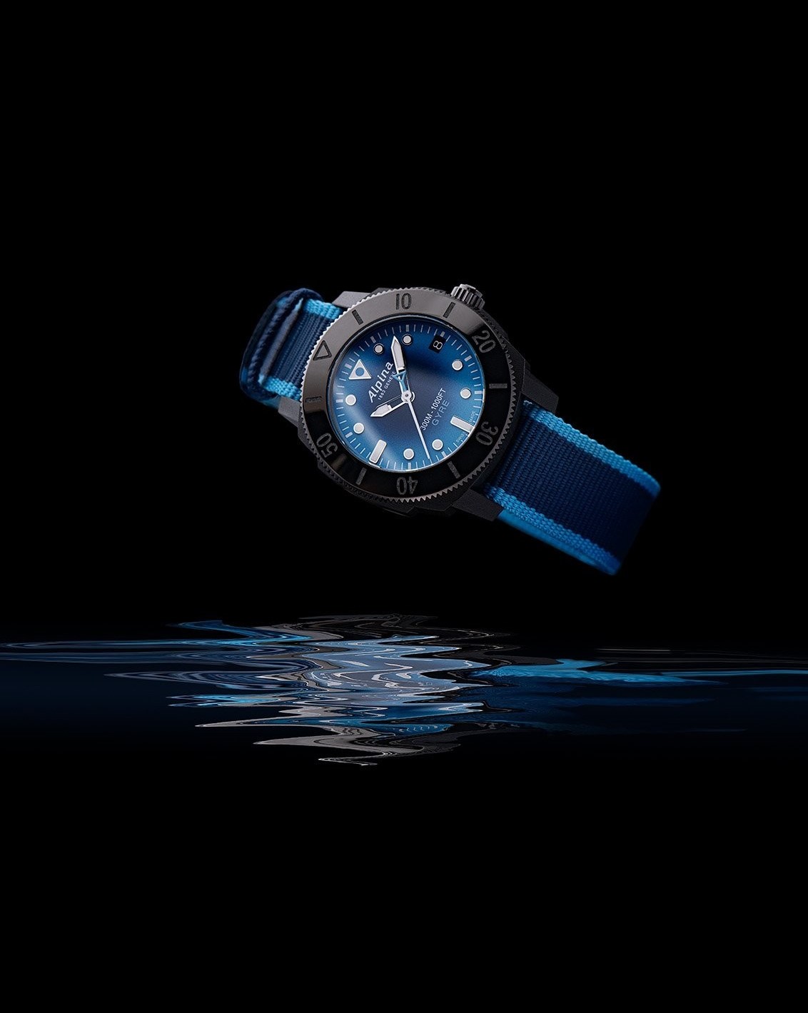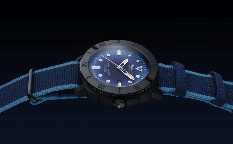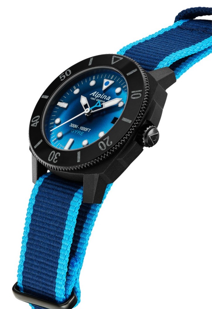 Alpina Seastrong Diver Gyre Limited Edition AL-525LNSB3VG6 sú dámske potápačské automatické hodinky na modrom NATO remienku vyrobenom z recyklovaných PET fliaš s tŕňovou sponou. Puzdro s priemerom 36 milimetrov je vyrobené z kompozitného materiálu v zložení 70% plastu . Puzdro disponuje jednosmerne otočnou lunetou a signovanou skrutkovacou korunkou. Modrý gradientný číselník s ukazovateľom dátumu na tretej hodine je chránený odolným zafírovým sklom s antireflexnou vrstvou. Ručičky a indexy disponujú luminiscenčným náterom LumiNova®, ktorý garantuje perfektné čitateľnosť za zhoršených svetelných podmienok. Pohon hodiniek zaisťuje spoľahlivý mechanický strojček AL-525 (základom je Sellita SW200) s automatickým náťahom a rezervou chodu 38 hodín. S vodotesnosťou 30 ATM sú hodinky vhodné pre prístrojové potápanie. Jedná sa o limitovanú edíciu v počte 1883 kusov pre celý svet dodávanú v modrej darčekovej krabičke vytvorenej z recyklovaného plastu, recyklovaného papiera a tkaniny rPET.