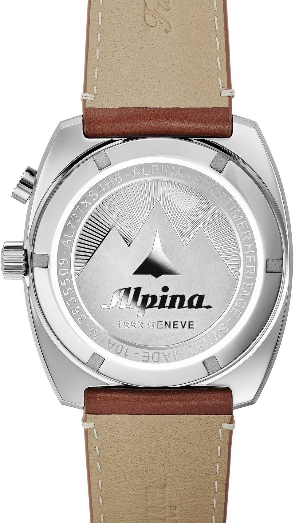 Alpina Startimer Pilot Heritage Automatic Chronograph AL-727SS4H6 sú pánske športové hodinky na hnedom koženom remienku s kontrastným prešívaním a tŕňovou sponou. Puzdro z nerezovej ocele má priemer 42 milimetrov a signovanú korunku. Strieborný číselník s efektom slnečného brusu, vnútornou lunetou s tachymetrickou stupnicou a modrými sčítačmi stopiek je chránený odolným zafírovým sklom s antireflexnou vrstvou. Ručičky a indexy disponujú luminiscenčným náterom Super-LumiNova®, ktorý garantuje perfektnú čitateľnosť za zhoršených svetelných podmienok. Pohon hodiniek zaisťuje spoľahlivý mechanický strojček AL-727 (základom je strojček La Joux-Perret 7773) s automatickým náťahom a rezervou chodu 55 hodín. S vodotesnosťou 10 ATM sú hodinky vhodné na plávanie a šnorchlovanie.
