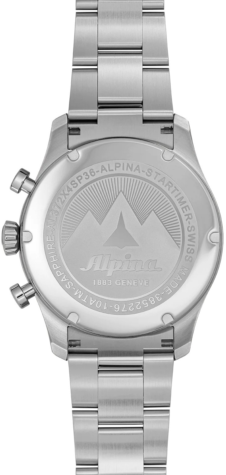 Alpina Startimer Pilot Quartz Chronograph Big Date AL-372GRS4S26B sú pánske športové batériové hodinky na oceľovom náramku v kombinácii brusu a lesku s preklápacou sponou. Puzdro z nerezovej ocele má priemer 41 milimetrov a signovanú skrutkovaciu korunku. Zeleno-strieborný číselník so stopkami a ukazovateľom dátumu na šiestej hodine je chránený odolným zafírovým sklom s antireflexnou vrstvou. Protiváhou centrálnej sekundovej ručičky je červený trojuholník - logo Alpiny symbolizujúce alpské vrcholy. Ručičky a indexy disponujú luminiscenčným náterom Super-LumiNova®, ktorý garantuje perfektnú čitateľnosť za zhoršených svetelných podmienok. Pohon hodiniek zaisťuje spoľahlivý quartzový strojček AL-372 (základom je strojček Ronda 8040.N). S vodotesnosťou 10 ATM sú hodinky vhodné na plávanie a šnorchlovanie.
