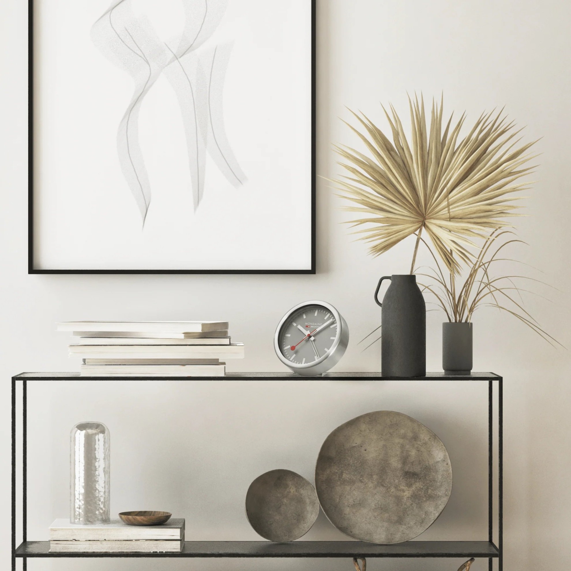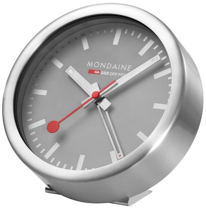 MONDAINE A997.MCAL.86SBV jsou nástěnné hodiny s hliníkovým pouzdrem o průměru 125 milimetrů, které lze využít také jako stolní hodiny. Číselník v matné šedé barvě je chráněn tvrzeným minerálním sklem a je inspirován ikonickými nádražními hodinami s červenou sekundovou ručkou. Konce hodinové a minutové ručky disponují luminiscenčním nátěrem, který usnadňuje čitelnost ve tmě. Chod hodin zajišťuje quartzový strojek s funkcí budíku.