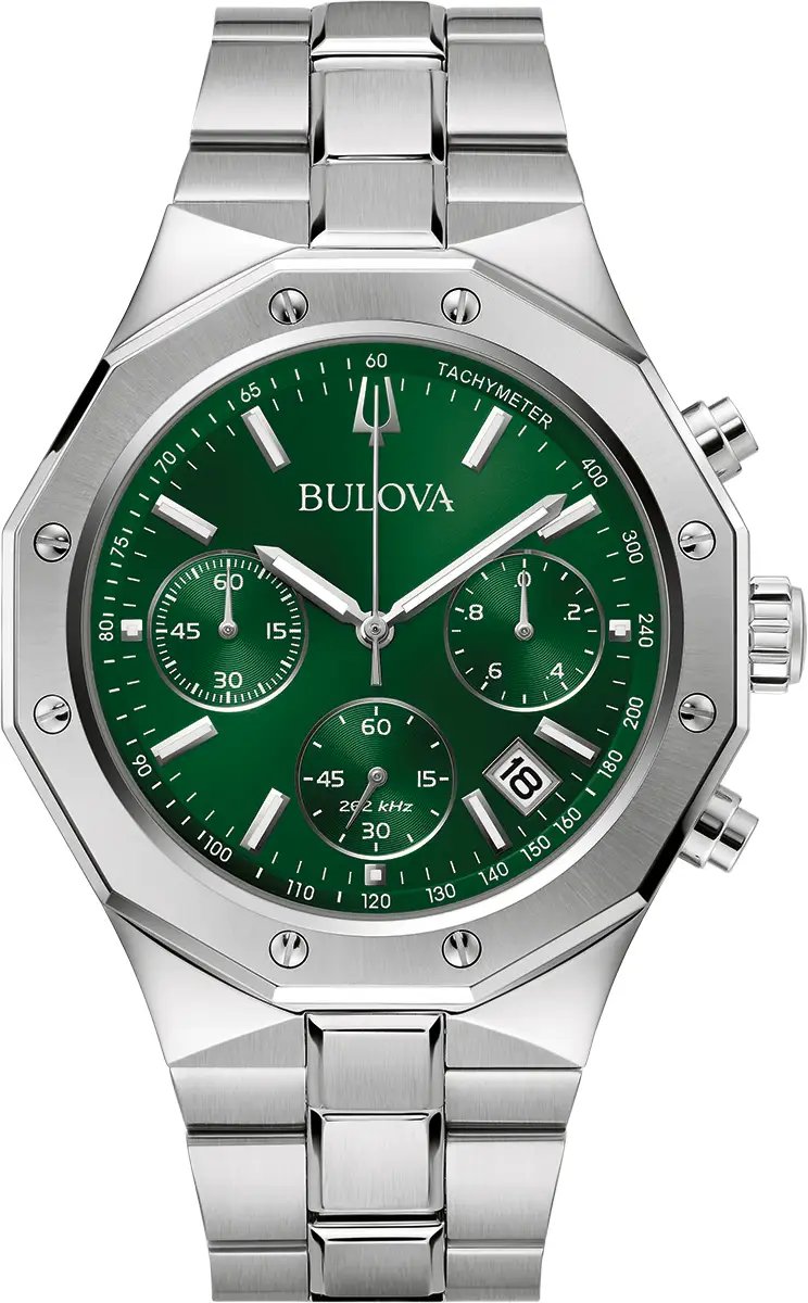 Bulova Classic Prestige Chronograph 96B409 sú pánske športové batériové hodinky v klasickom štýle na oceľovom náramku s preklápacou sponou. Puzdro z nerezovej ocele má priemer 44 milimetrov a dvanásťhrannú lunetu. Zelený číselník s efektom slnečného brusu, stopkami, ukazovateľom dátumu a vnútornou tachymetrickou lunetou je chránený minerálnym sklom. Ručičky a indexy pokrýva luminiscenčný náter, ktorý po nasvietení garantuje perfektnú čitateľnosť za zhoršených svetelných podmienok. Pohon hodiniek zaisťuje vysokofrekvenčný quartzový strojček NM50 s extrémnou presnosťou chodu s odchýlkou ​​približne 10 sekúnd za rok. S vodotesnosťou 10 ATM sú hodinky vhodné na plávanie a šnorchlovanie.