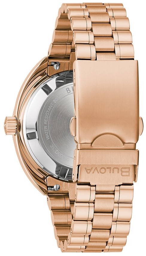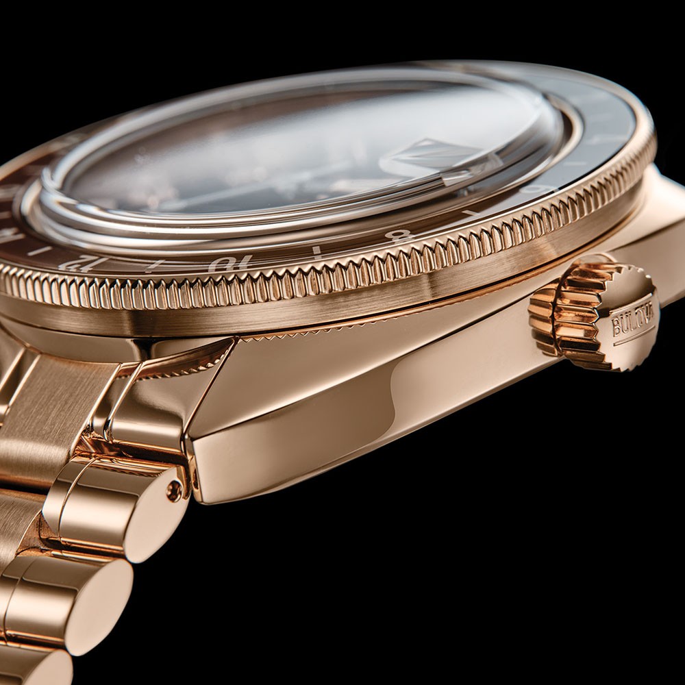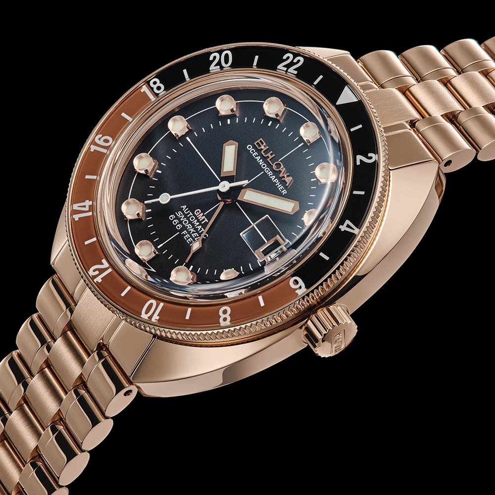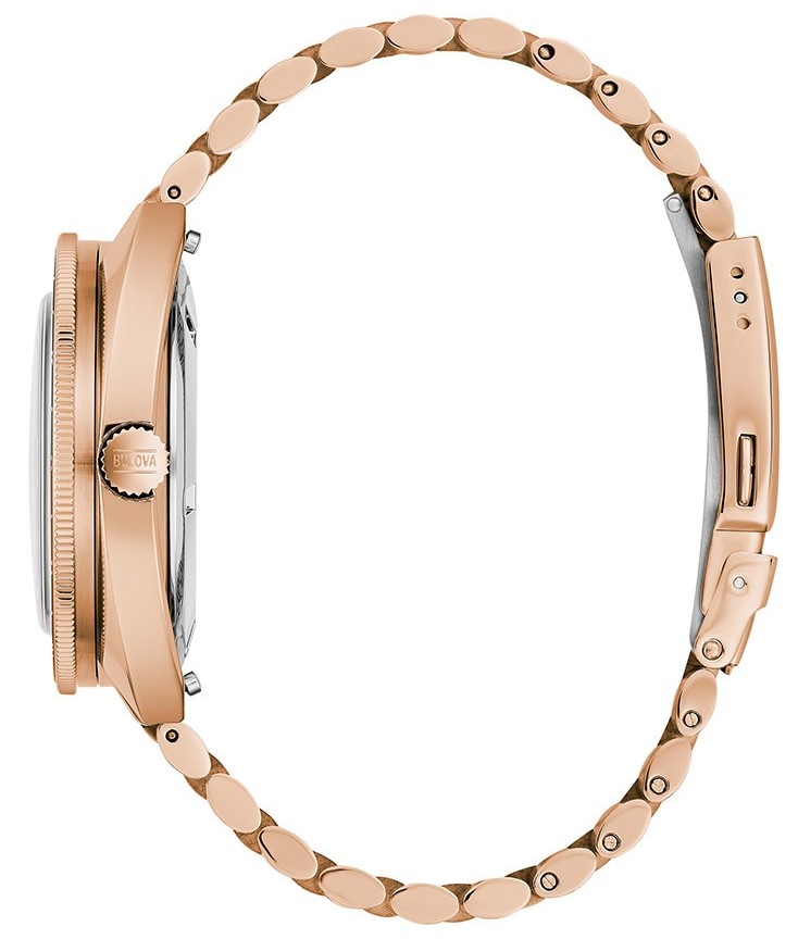 Bulova Oceanographer Automatic GMT 97B215 sú pánske klasické automatické hodinky na oceľovom náramku s povrchovou PVD úpravou vo farbe ružového zlata a preklápacou sponou. Puzdro z nerezovej ocele v rovnakej farbe má priemer 41 milimetrov, obojsmerne otočnú GMT lunetu s 24-hodinovou stupnicou a skrutkovaciu korunku. Čierny číselník s ukazovateľom dátumu na tretej hodine je chránený odolným zafírovým sklom. Ručičky a indexy pokrýva luminiscenčný náter, ktorý po nasvietení garantuje perfektnú čitateľnosť za zhoršených svetelných podmienok. Pohon hodiniek zaisťuje mechanický strojček Miyota 9075 s automatickým náťahom a rezervou chodu 42 hodín. S vodotesnosťou 20 ATM sú hodinky vhodné pre hlbinné potápanie.