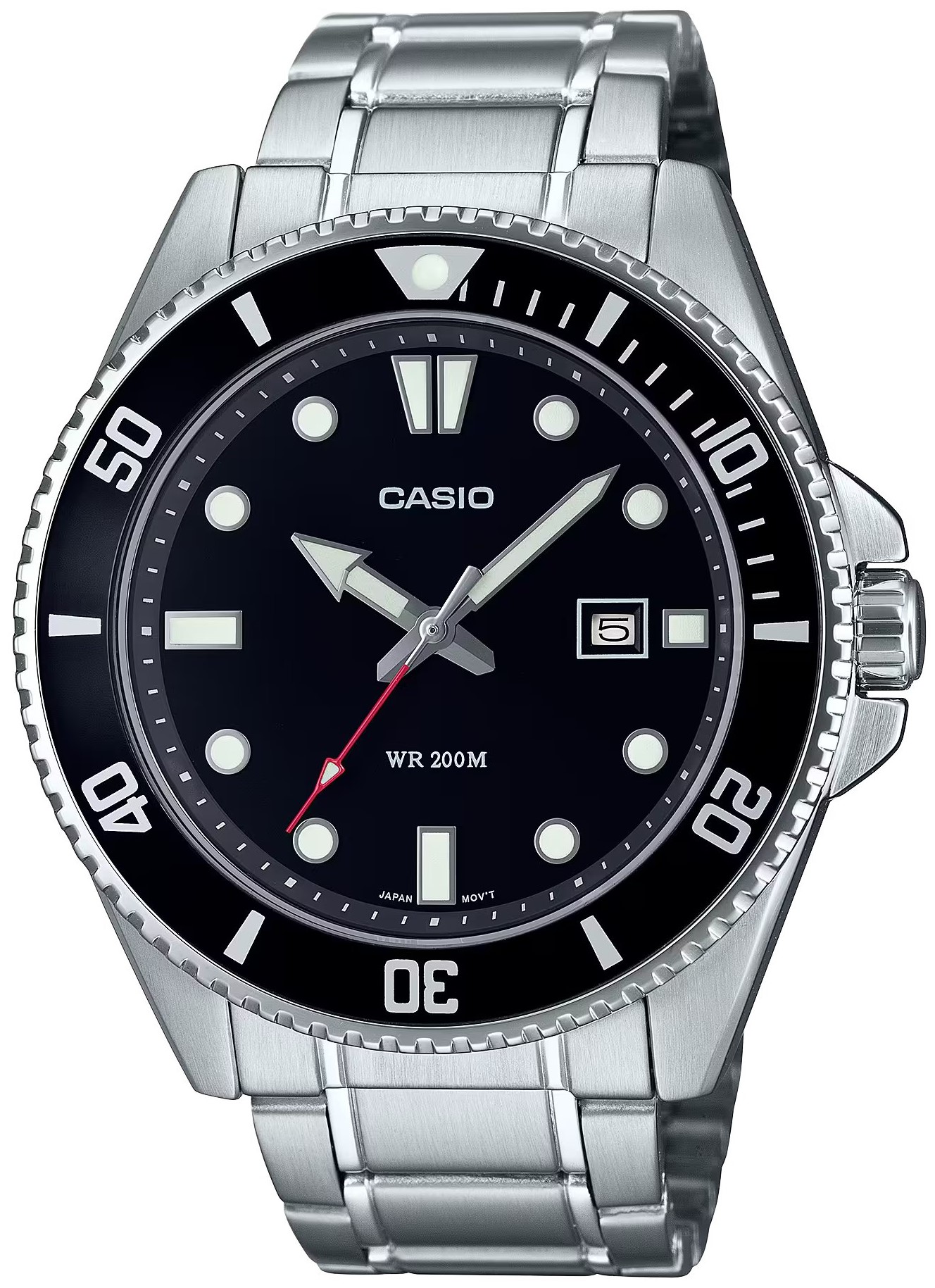 Casio Collection MDV-107D-1A1VEF sú pánske quartzové hodinky v klasickom štýle s oceľovým náramkom s preklápacou sponou. Puzdro z nerezovej ocele má priemer 44,2 milimetra, skrutkovaciu korunku a čiernu jednosmerne otočnú hliníkovú lunetu s potápačskou stupnicou. Priehľadný čierny číselník s ukazovateľom dátumu na tretej hodine je chránený minerálnym sklom. Ručičky a indexy vybavené luminiscenčnou vrstvou po nasvietení zaisťujú lepšiu čitateľnosť za zhoršených svetelných podmienok. Vodotesnosť hodiniek činí 20 ATM a sú teda vhodné na plávanie a potápanie.