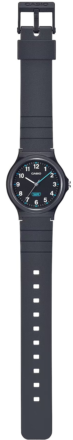 Casio Collection LQ-24B-1BEF sú dámske športové batériové hodinky, ktorých puzdro s priemerom 31,5 milimetra je spolu s remienkom vyrobené zo živice v čiernej farbe. Čierny číselník s bielymi a modrými detailmi je chránený plastovým sklom. Hodinky sú odolné pri náhodnom kontakte s vodou, napríklad pri umývaní rúk av daždi.