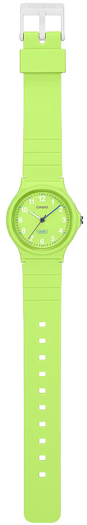 Casio Collection LQ-24B-3BEF sú dámske športové batériové hodinky, ktorých puzdro s priemerom 31,5 milimetra je spolu s remienkom vyrobené zo živice v zelenej farbe. Zelený číselník s bielymi a modrými detailmi je chránený plastovým sklom. Hodinky sú odolné pri náhodnom kontakte s vodou, napríklad pri umývaní rúk av daždi.
