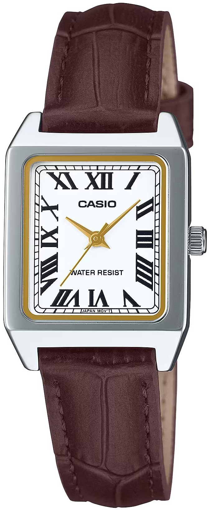 Casio Collection LTP-B150L-7B2EF sú dámske elegantné quartzové hodinky s obdĺžníkovým oceľovým puzdrom s veľkosťou 22 x 31 milimetrov, na ktorý plynule nadväzuje hnedý remienok z kože s tŕňovou sponou. Biely číselník s čiernymi rímskymi číslicami a detailmi vo farbe zlata je chránený minerálnym sklom. Hodinky sú odolné pri náhodnom kontakte s vodou, napríklad pri umývaní rúk a v daždi.