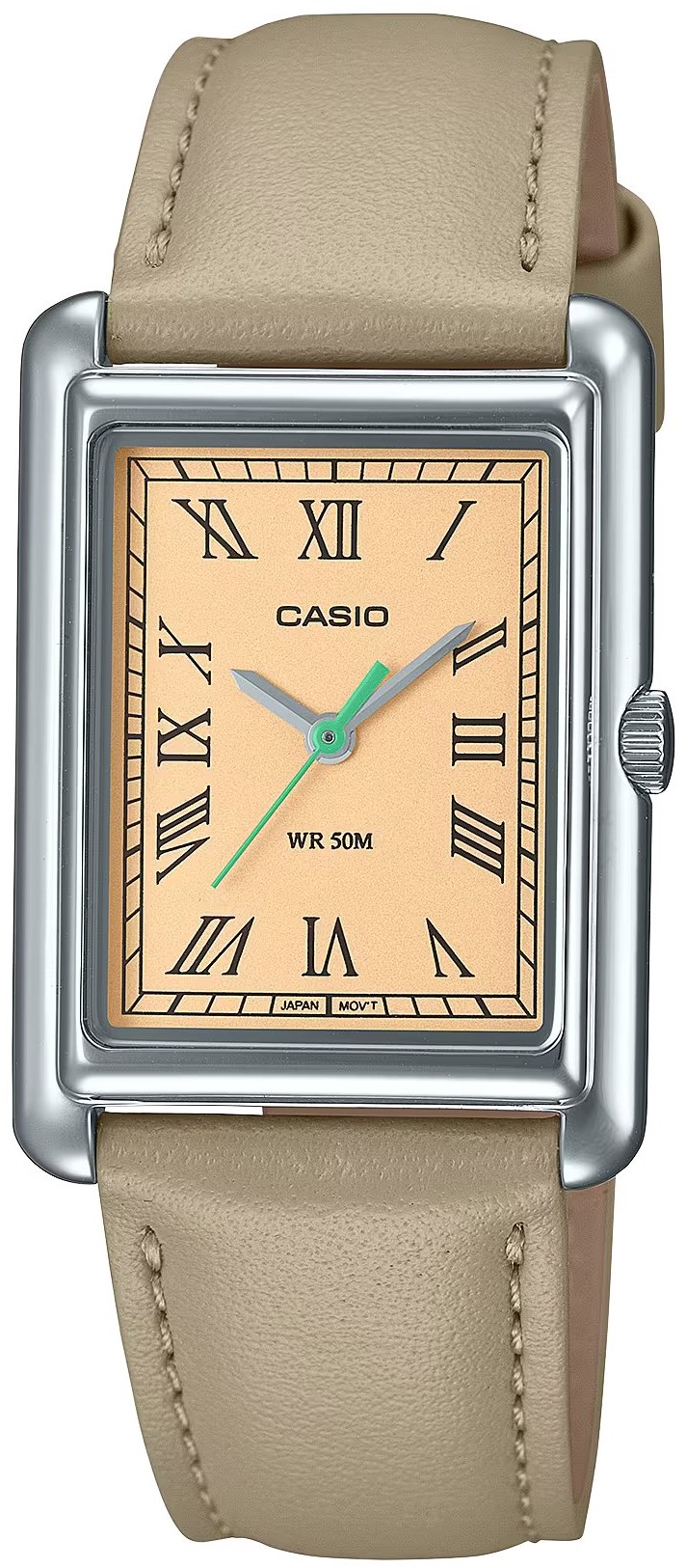 Casio Collection LTP-B165L-5BVEF sú dámske elegantné quartzové hodinky s obdĺžnikovým oceľovým puzdrom s veľkosťou 24,5 x 34,5 milimetra, na ktorý plynule nadväzuje béžový remienok z kože s tŕňovou sponou. Oranžový číselník s čiernymi rímskymi číslicami je chránený minerálnym sklom. Vodotesnosť hodiniek činí 5 ATM a sú teda odolné proti dažďu a pri sprchovaní.