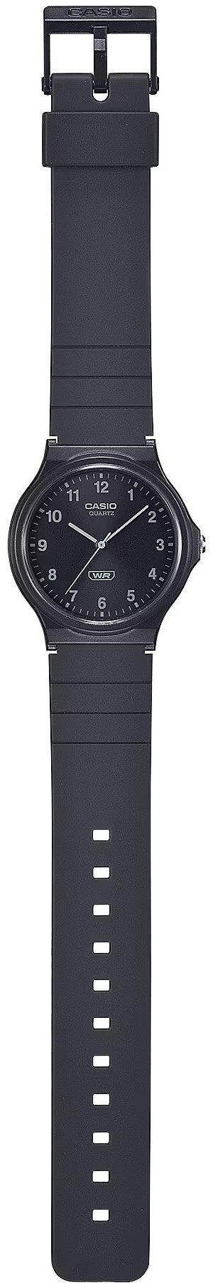 Casio Collection MQ-24B-1BEF sú unisex športové batériové hodinky, ktorých puzdro s priemerom 34,9 milimetra je spolu s remienkom vyrobené zo živice v čiernej farbe. Čierny číselník s kontrastnými šedými rúčkami a indexmi je chránený plastovým sklom. Hodinky sú odolné pri náhodnom kontakte s vodou, napríklad pri umývaní rúk av daždi.