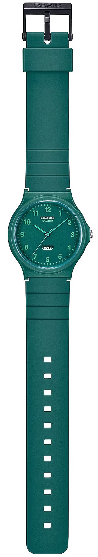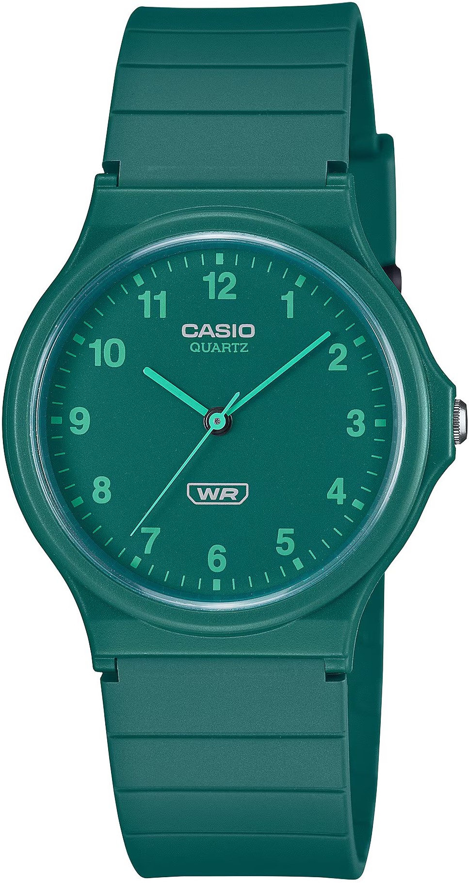 Casio Collection MQ-24B-3BEF sú unisex športové batériové hodinky, ktorých puzdro s priemerom 34,9 milimetra je spolu s remienkom vyrobené zo živice v zelenej farbe. Zelený číselník s tyrkysovými ručičkami a indexmi je chránený plastovým sklom. Hodinky sú odolné pri náhodnom kontakte s vodou, napríklad pri umývaní rúk av daždi.