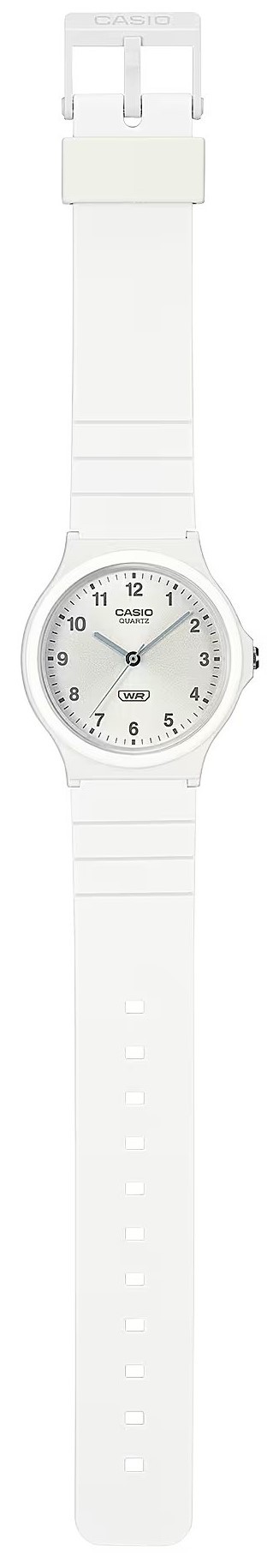 Casio Collection MQ-24B-7BEF jsou unisex sportovní bateriové hodinky, jejichž pouzdro o průměru 34,9 milimetru je spolu s řemínkem vyrobeno z pryskyřice v bílé barvě. Stříbrný číselník s efektem slunečního brusu, se šedými ručkami a indexy je chráněn plastovým sklem. Hodinky jsou odolné při náhodném kontaktu s vodou, například při mytí rukou a v dešti.
