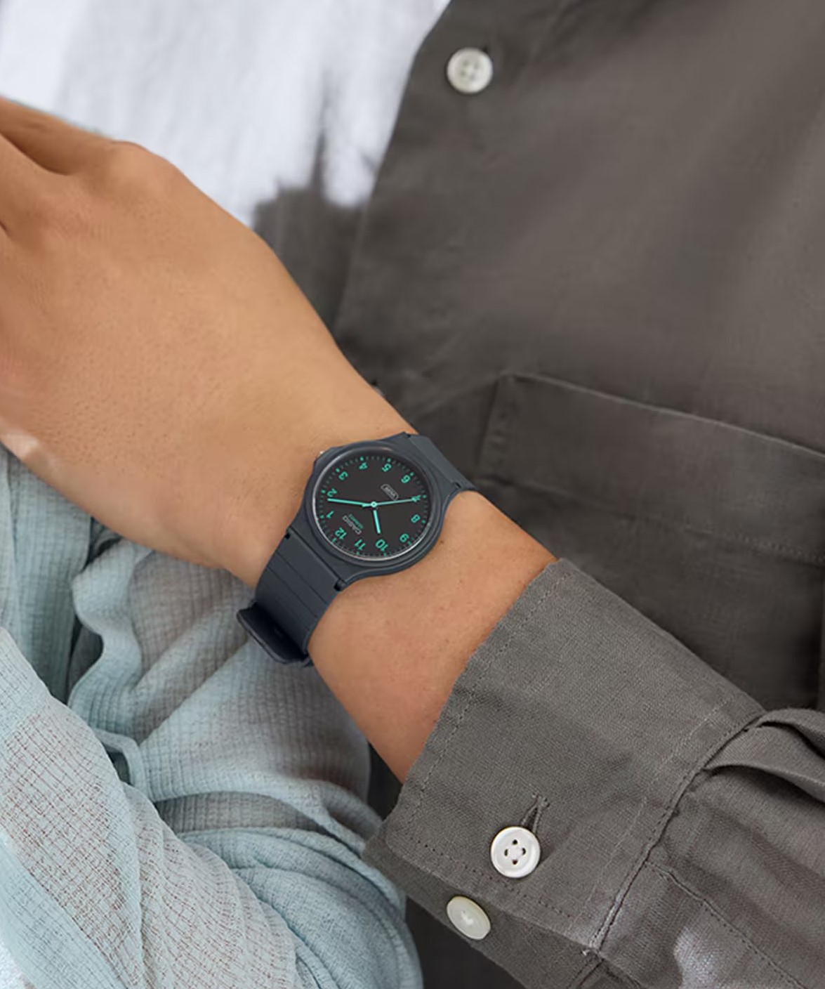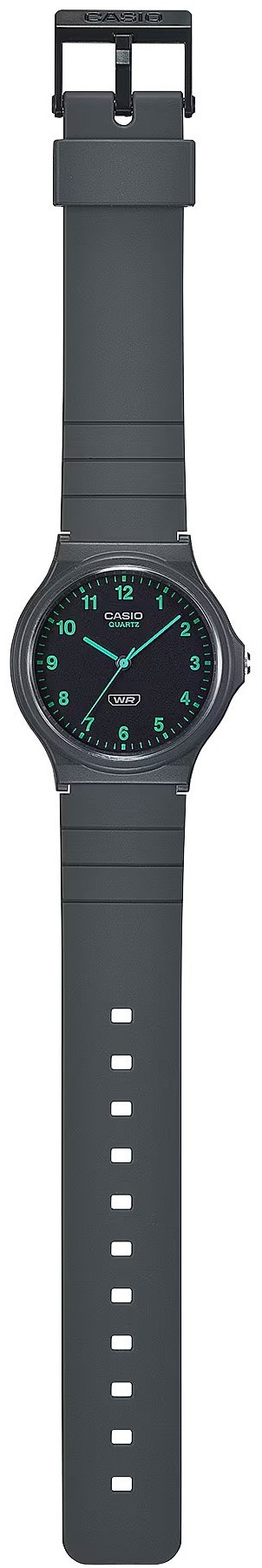 Casio Collection MQ-24B-8BEF sú unisex športové batériové hodinky, ktorých puzdro s priemerom 34,9 milimetra je spolu s remienkom vyrobené zo živice v šedej farbe. Čierny číselník s tyrkysovými rúčkami a indexmi je chránený plastovým sklom. Hodinky sú odolné pri náhodnom kontakte s vodou, napríklad pri umývaní rúk av daždi.