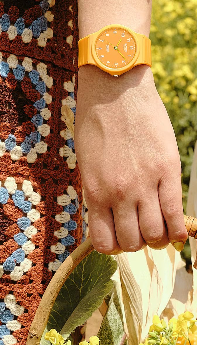 Casio Collection MQ-24B-9BEF sú unisex športové batériové hodinky, ktorých puzdro s priemerom 34,9 milimetra je spolu s remienkom vyrobené zo živice v oranžovej farbe. Oranžový číselník so žltými rúčkami a bielymi indexmi je chránený plastovým sklom. Hodinky sú odolné pri náhodnom kontakte s vodou, napríklad pri umývaní rúk av daždi.
