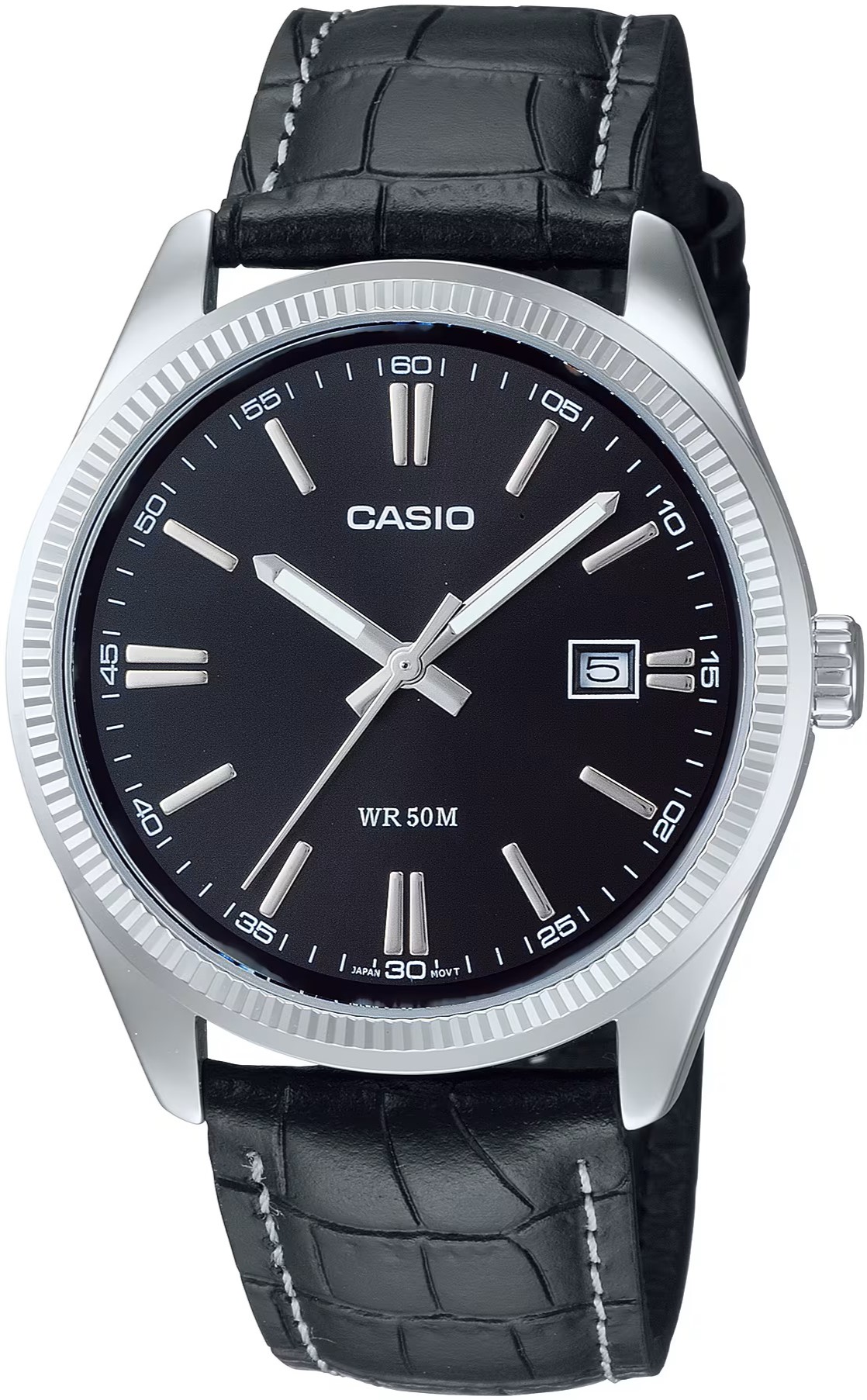Casio Collection MTP-1302PL-1AVEF jsou pánské quartzové hodinky v elegantním stylu s mosazným pouzdrem o průměru 38,5 milimetru, které doplňuje černý řemínek z kůže zdobený bílým prošíváním. Přehledný černý číselník s ukazatelem data na třetí hodině je chráněn minerálním sklem. Ručičky vybavené luminiscenční vrstvou po nasvícení zajišťují lepší čitelnost za zhoršených světelných podmínek. Vodotěsnost hodinek činí 5 ATM a jsou tedy odolné proti dešti a při sprchování.