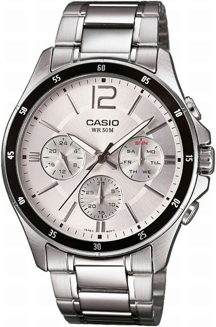 Casio Collection MTP-1374PD-7AVEF jsou pánské quartzové hodinky v klasickém stylu na ocelovém náramku s překlápěcí sponou. Ocelové pouzdro má průměr 43,5 milimetru a černou lunetu s minutovou stupnicí. Stříbrný číselník s ukazatelem data, dne v týdnu a 24hodinovým formátem zobrazení času je chráněn minerálním sklem. Ručičky vybavené luminiscenční vrstvou po nasvícení zajišťují lepší čitelnost za zhoršených světelných podmínek. S vodotěsností 5 ATM jsou hodinky odolné proti dešti a při sprchování.