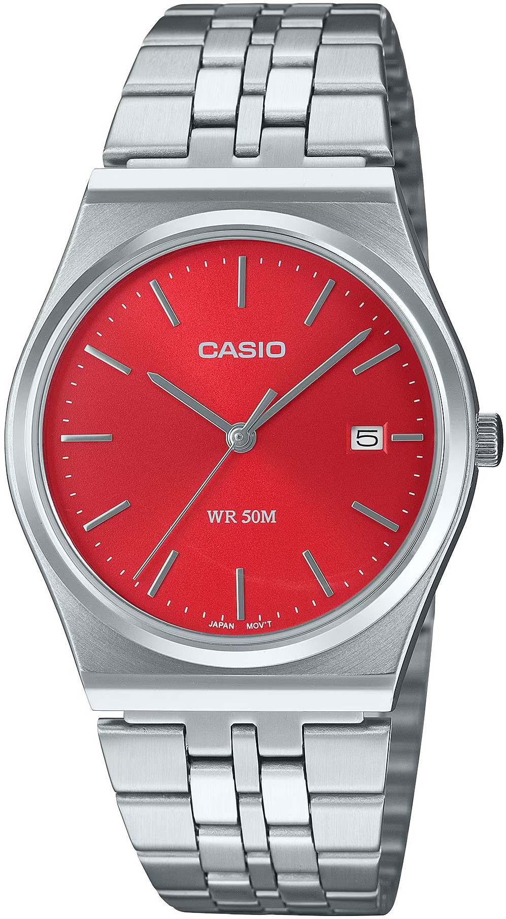 Casio Collection MTP-B145D-4A2VEF sú unisex quartzové hodinky v klasickom dizajne s päťradovým oceľovým náramkom s preklápacou sponou a oceľovým puzdrom s priemerom 35 milimetrov. Žiarivo červený číselník s efektom slnečného brusu a ukazovateľom dátumu na tretej hodine je chránený minerálnym sklom. Vodotesnosť hodiniek činí 5 ATM a sú teda odolné proti dažďu a pri sprchovaní.