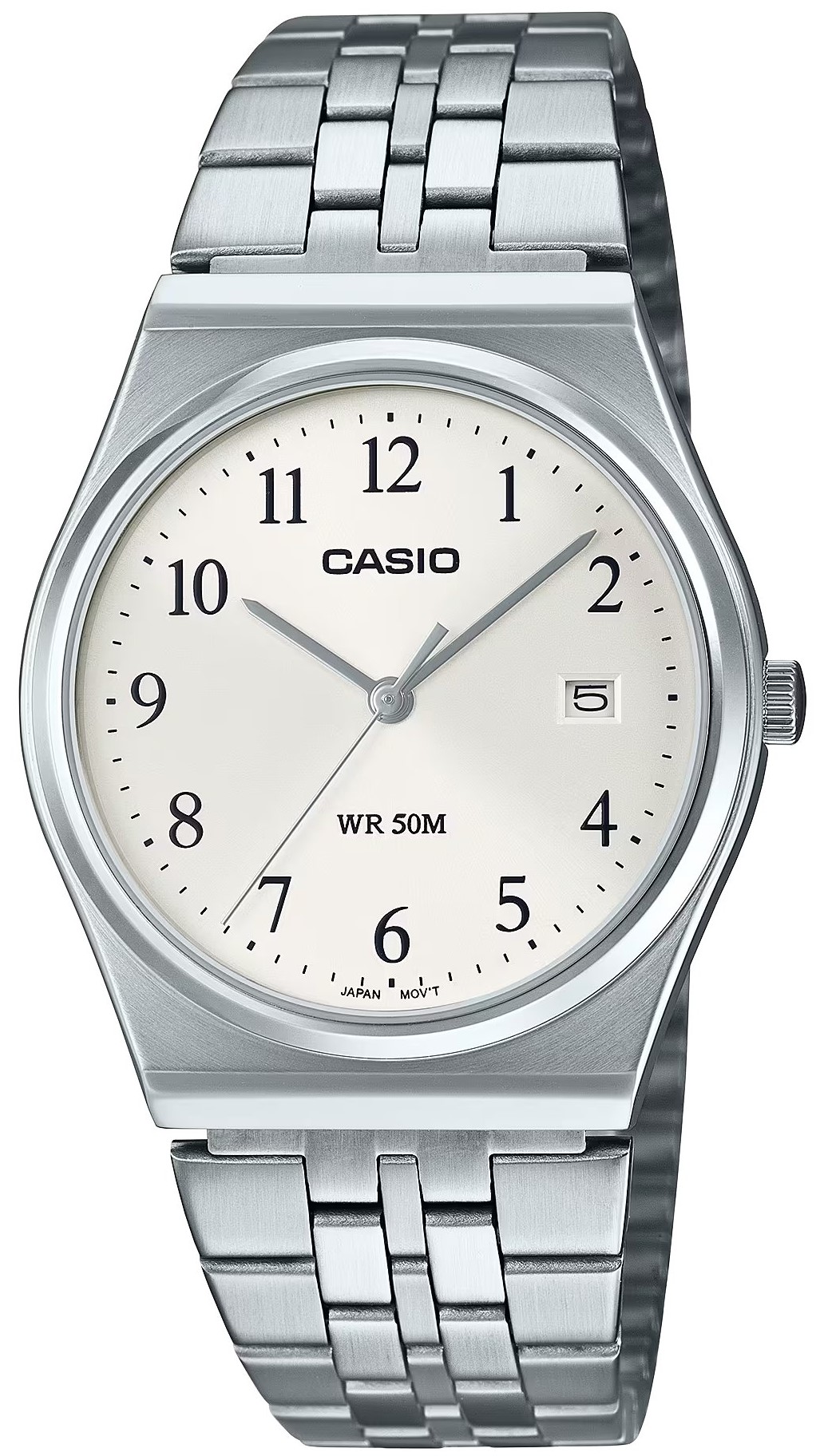 Casio Collection MTP-B145D-7BVEF sú unisex quartzové hodinky v klasickom dizajne s päťradovým oceľovým náramkom s preklápacou sponou a oceľovým puzdrom s priemerom 35 milimetrov. Strieborný číselník s efektom slnečného brusu a ukazovateľom dátumu na tretej hodine je chránený minerálnym sklom. Vodotesnosť hodiniek činí 5 ATM a sú teda odolné proti dažďu a pri sprchovaní.