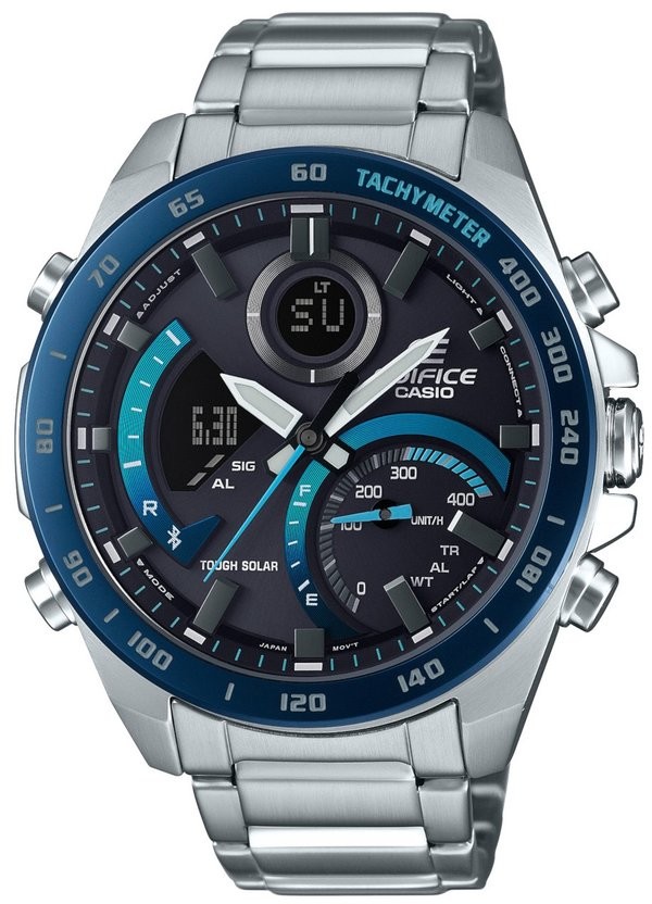 Casio Edifice Bluetooth Solar ECB-900DB-1BER sú pánske športové hodinky, ktorých puzdro s priemerom 48 milimetrov vybavené pevnou lunetou s tachymetrickou stupnicou je spolu s náramkom vyrobené z nerezovej ocele. Čierny kombinovaný číselník s modrými detailmi je chránený minerálnym sklíčkom. Ručičky a indexy sú pokryté luminiscenčnou vrstvou, ktorá spolu s dvojitým LED podsvietením displeja zaisťuje lepšiu čitateľnosť za zhoršených svetelných podmienok. Hodinky poháňa solárny batériový strojček, odpadá tak nutnosť výmeny batérie. Stav nabitia je možné sledovať na číselníku. Hodinky disponujú funkciou stopiek s presnosťou 1/1000 sekúnd, timerom, kalendárom vrátane ukazovateľa dátumu, dňa v týždni a mesiace, budíkom, meraním rýchlosti a svetovým časom (až pre 300 miest). Dajú sa synchronizovať s chytrým telefónom pomocou technológie Bluetooth a vďaka funkcii Phone finder sa po stlačení tlačidla hodiniek rozoznie váš telefón, čo uľahčí jeho hľadanie. Vodotesnosť hodiniek je 10 ATM a sú teda vhodné na plávanie aj šnorchlovanie.