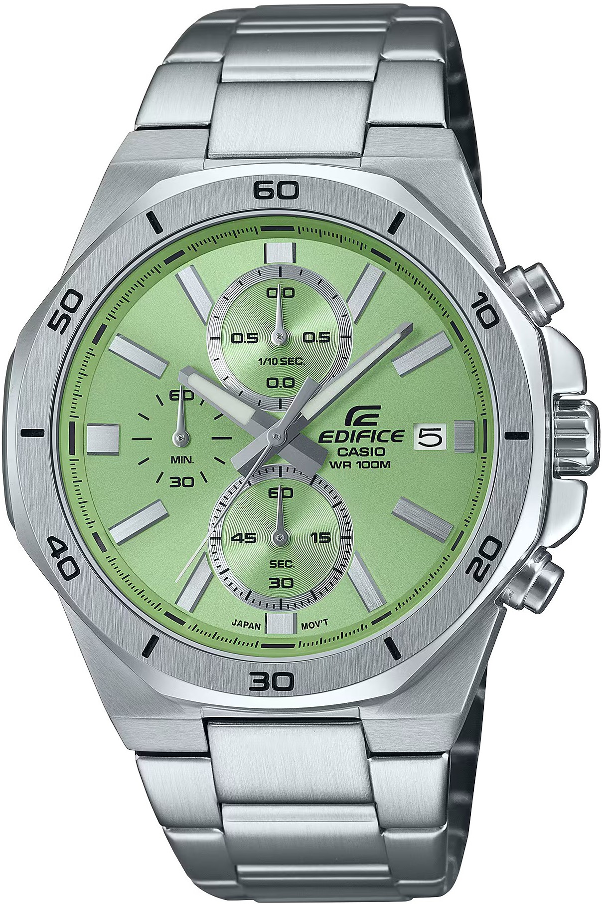 Casio Edifice Chronograph EFV-640D-3AVUEF jsou pánské sportovní quartzové hodinky, jejichž pouzdro o průměru 44,3 milimetru je spolu s náramkem vyrobeno z nerezové oceli. Zelený číselník s efektem slunečního brusu, chronografem a ukazatelem data na třetí hodině je chráněn minerálním sklíčkem. Ručičky jsou vybaveny luminiscenční vrstvou, která po nasvícení zajišťuje lepší čitelnost za zhoršených světelných podmínek. Hodinky s vodotěsností 10 ATM jsou vhodné pro plavání i šnorchlování.