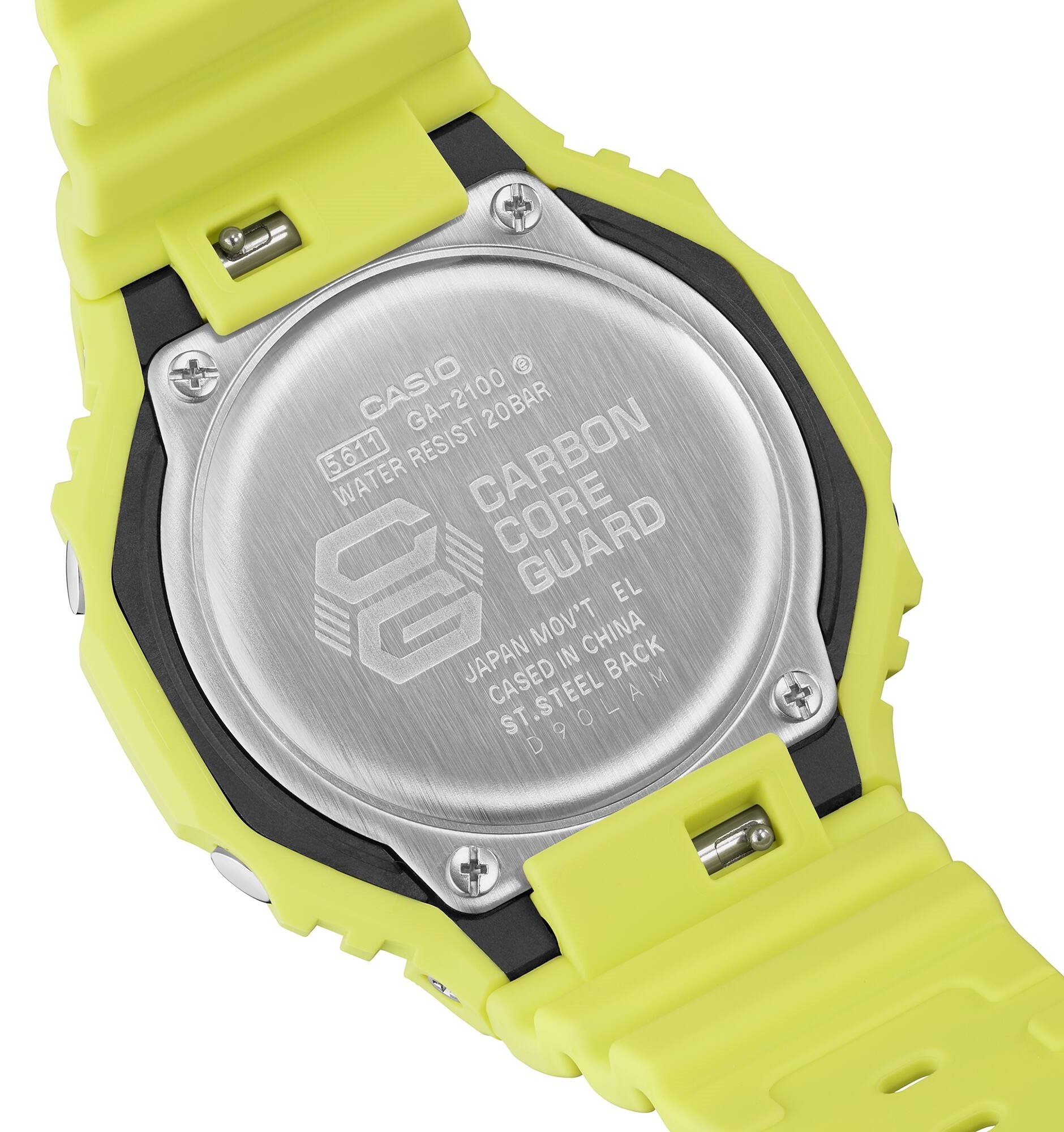 Séria G-Shock GA-2100 predstavuje najtenšie hodinky zo súčasných modelov G-Shock, ktorých puzdro s priemerom 45,4 milimetrov vyrobené zo živice má totiž výšku iba 11,8 milimetrov. Puzdro disponuje novým poňatím lunety pôvodného modelu G-Shock DW-5000C z roku 1983, na ktorý táto rada nadväzuje. Okrem nového dizajnu sa táto kolekcia od modelu DW-5000C líši novou konštrukciou Carbon Core Guard alebo vystužením puzdra karbónovými vláknami, ktoré zaisťuje vysokú odolnosť puzdra a zároveň nízku hmotnosť hodiniek – iba 51 gramov. Tradične tvarovaný remienok s tŕňovou sponou je vyrobený zo živice s matnou úpravou. O chod hodiniek sa stará batéria so životnosťou až 3 roky a je možné sa s nimi aj potápať, pretože ich vodotesnosť dosahuje 200 metrov.