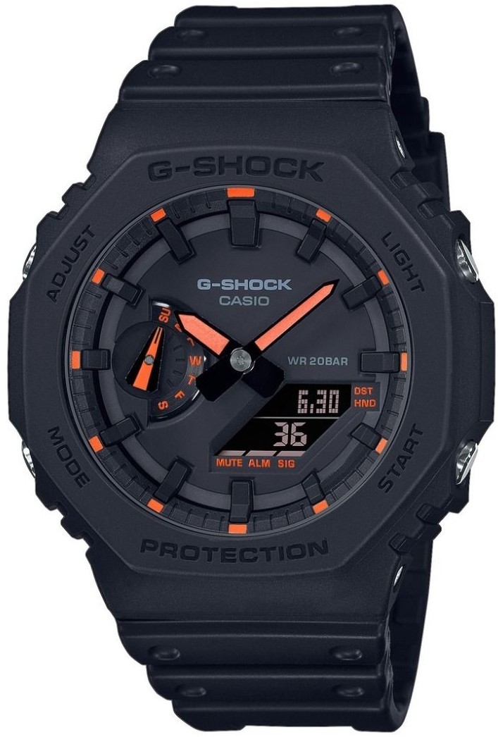 Kolekcia G-Shock GA-2100 predstavuje najtenšie hodinky zo súčasných modelov G-Shock, ich puzdro s priemerom 45,4 milimetrov vyrobené zo živice má totiž výšku iba 11,8 milimetrov. Puzdro disponuje novým poňatím lunety pôvodného modelu G-Shock DW-5000C z roku 1983, na ktorý tento rad nadväzuje. Okrem nového dizajnu sa tento rad od modelu DW-5000C líši novou konštrukciou Carbon Core Guard alebo vystužením puzdra karbónovými vláknami, ktoré zaisťuje vysokú odolnosť puzdra a zároveň nízku hmotnosť hodiniek – iba 51 gramov. Tradične tvarovaný remienok s tŕňovou sponou je vyrobený zo živice s matnou úpravou. O chod hodiniek sa stará batéria so životnosťou až 3 roky a je možné sa s nimi aj potápať, pretože ich vodotesnosť dosahuje 200 metrov.