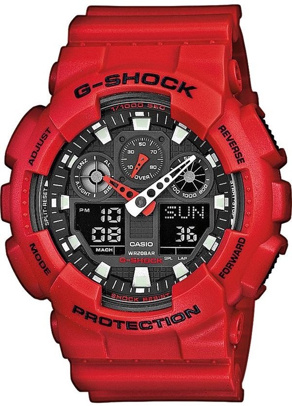 Jedny z najpredávanejších modelov Casio G-Shock GA-100 disponujú typicky športovým vzhľadom, ktorý zaisťuje nielen živičný remienok s tŕňovou sponou, ale aj masívne puzdro zo živice s priemerom 51,2 milimetra, ktoré je odolné voči nárazom a magnetizmu. Vodotesnosť hodiniek je 200 metrov.