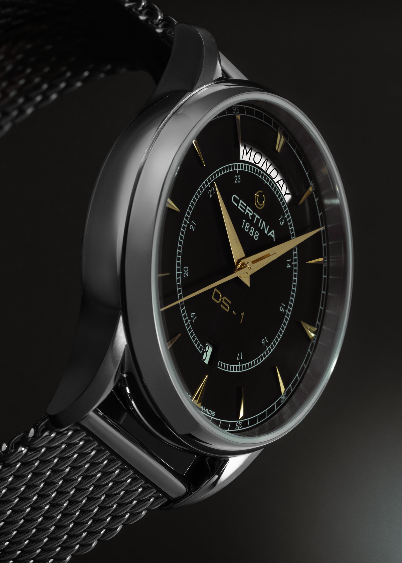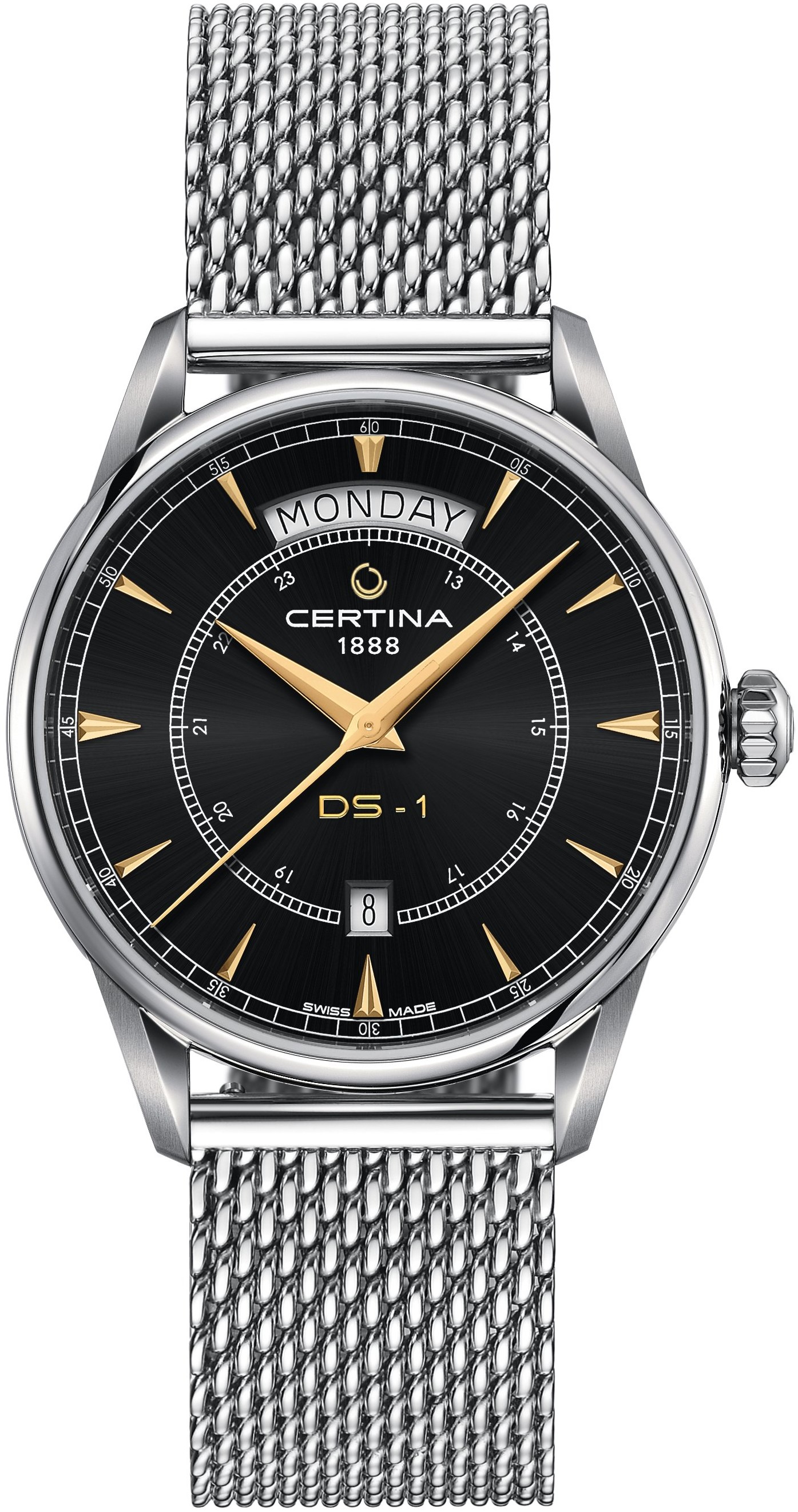 Certina DS-1 Day Date C029.430.11.051.00 sú pánske automatické hodinky na kovovom milánskom ťahu s motýlikovou sponou inšpirované prvým konceptom hodiniek DS vyrobeným Certinou v roku 1960. Puzdro z nerezovej ocele v  kombinácii brusu a lesku má priemer 40 milimetrov a priehľadné viečko. Čierny číselník s indikáciou dátumu a 24-hodinovou stupnicou na strede je krytý odolným klenutým zafírovým sklom s antireflexnou vrstvou a na prvý pohľad zaujme zaobleným indikátorom dňa v týždni na dvanástej hodine. Aplikované hodinové indexy sú s elegantnými dauphine ručičkami vyvedené v zlatej farbe. Pohon hodiniek zaisťuje mechanický strojček ETA 2834-2 s automatickým náťahom a rezervou chodu približne 38 hodín. Tento strojček s funkciou hackingu je možné v prípade potreby naťahovať aj ručne pomocou signovanej korunky. Model disponuje technológiou DS (Double Security) používanou a zdokonaľovanou už od roku 1959, vďaka ktorej majú hodinky zvýšenú odolnosť voči nárazom a vode. Vodotesnosť hodiniek činí 10 ATM a sú teda vhodné na kúpanie alebo šnorchlovanie.