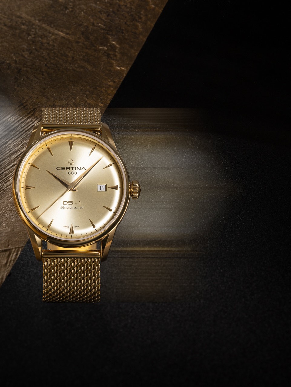 Certina DS-1 Powermatic 80 C029.807.33.361.00 sú pánske automatické hodinky na kovovom milánskom ťahu s PVD úpravou zlatej farby a motýlikovou sponou inšpirované prvým konceptom hodiniek DS vyrobeným Certinou v roku 1960. Puzdro z nerezovej ocele 40 milimetrov a priehľadné viečko. Zlatý číselník s efektom slnečného brusu a indikáciou dátumu je kryt odolným zafírovým sklom s antireflexnou vrstvou. Aplikované hodinové indexy sú spolu s dauphine ručičkami vyvedené v zlatej farbe. Pohon hodiniek zaisťuje mechanický strojček Powermatic 80.611 s automatickým náťahom a rezervou chodu približne 80 hodín.Kaliber je vybavený vláskom zotrvačky Nivachron™, čo je špeciálny antimagnetický materiál, vďaka ktorému sú hodinky veľmi odolné voči magnetickým poliam. Tento strojček s funkciou hackingu je možné v prípade potreby naťahovať aj ručne pomocou signovanej korunky. Model disponuje technológiou DS (Double Security) používanou a zdokonaľovanou už od roku 1959, vďaka ktorej majú hodinky zvýšenú odolnosť voči nárazom a vode. Vodotesnosť hodiniek činí 10 ATM a sú teda vhodné na kúpanie alebo šnorchlovanie.