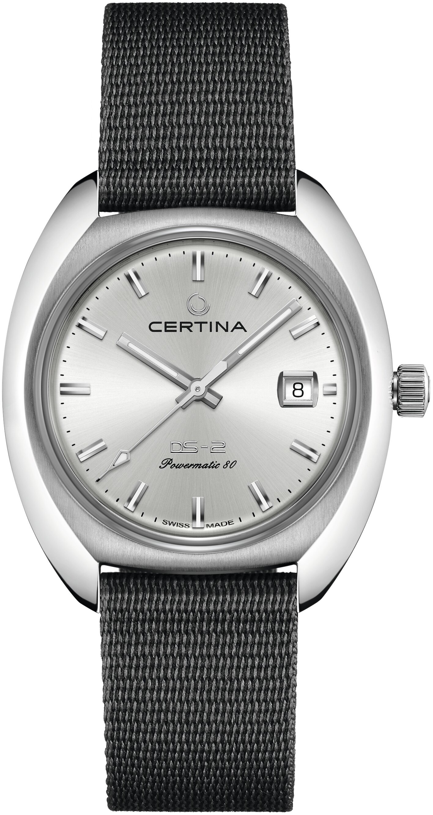 Certina DS-2 C024.407.18.031.00 sú pánske automatické hodinky na šedo-čiernom textilnom remienku z materiálu #tide ocean – recyklovaného plastu vyloveného z mora. Hodinky nadväzujú na populárny spoľahlivý model DS-2 z roku 1968. Puzdro z nerezovej ocele v tvare „tonneau“, elipsy zakončené na oboch koncoch, má priemer 40 milimetrov a priehľadné viečko. Strieborný číselník s efektom slnečného brusu a indikáciou dátumu je chránený klenutým zafírovým sklom s antireflexnou vrstvou. Vintage charakter hodiniek zdôrazňujú hranaté ručičky a hodinové indexy pokryté luminiscenčným náterom Super-LumiNova®, ktorý garantuje perfektnú čitateľnosť za zhoršených svetelných podmienok. Pohon hodiniek zaisťuje mechanický strojček Powermatic 80.611 s automatickým náťahom a rezervou chodu približne 80 hodín. Kaliber je vybavený vláskom zotrvačky Nivachron™, čo je špeciálny antimagnetický materiál, vďaka ktorému sú hodinky veľmi odolné voči magnetickým poliam. Tento strojček s funkciou hackingu je možné v prípade potreby naťahovať aj ručne pomocou skrutkovacej korunky. Model disponuje technológiou DS (Double Security) používanou a zdokonaľovanou už od roku 1959, vďaka ktorej majú hodinky zvýšenú odolnosť voči nárazom a vode. Vodotesnosť hodiniek robí 20 ATM a sú vhodnou voľbou na šnorchlovanie a potápanie.