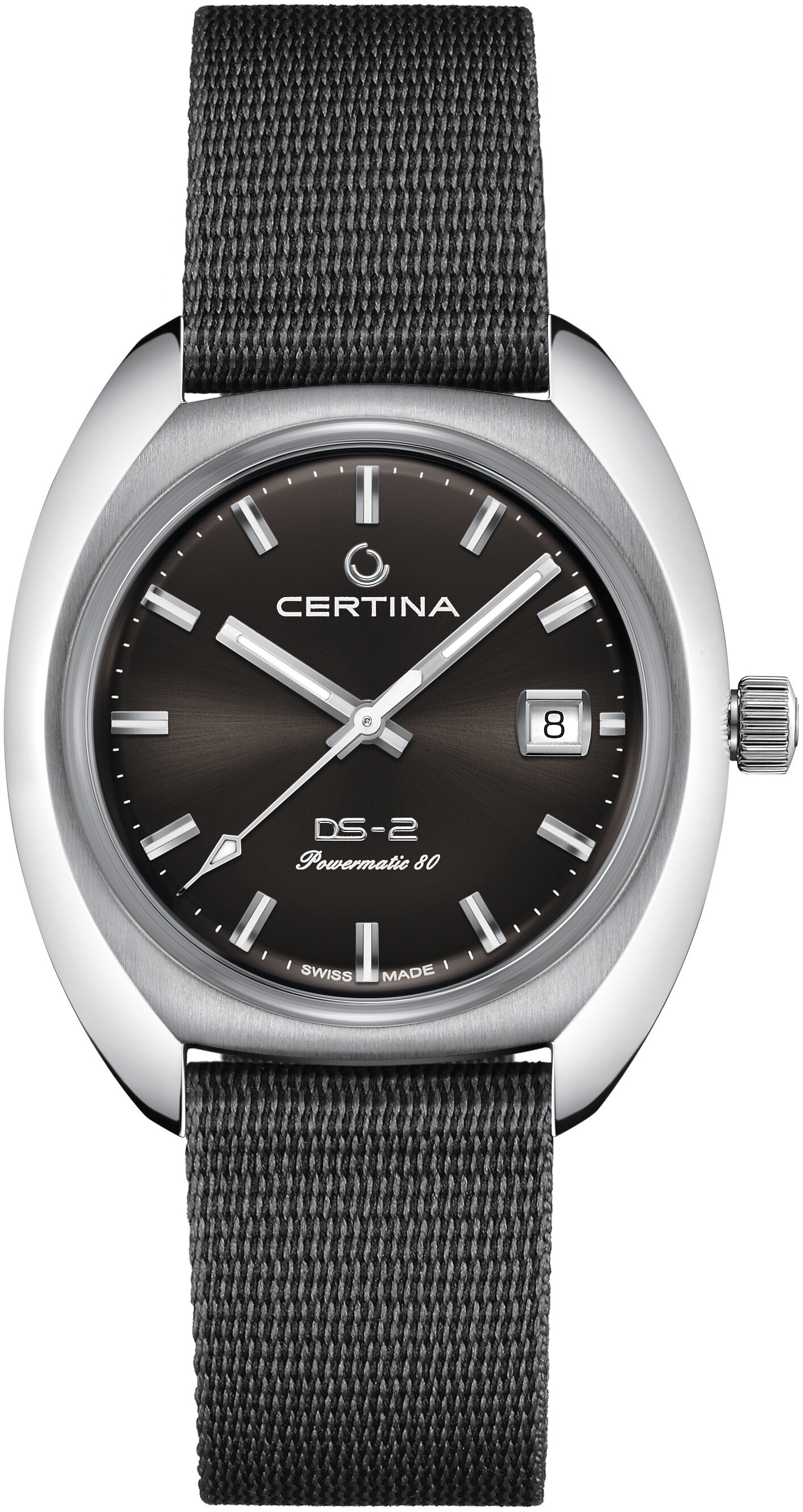 Certina DS-2 C024.407.18.081.00 sú pánske automatické hodinky na šedo-čiernom textilnom remienku z materiálu #tide ocean – recyklovaného plastu vyloveného z mora. Hodinky nadväzujú na populárny spoľahlivý model DS-2 z roku 1968. Puzdro z nerezovej ocele v tvare „tonneau“, elipsy zakončené na oboch koncoch, má priemer 40 milimetrov a priehľadné viečko. Šedý číselník s efektom slnečného brusu a indikáciou dátumu je chránený klenutým zafírovým sklom s antireflexnou vrstvou. Vintage charakter hodiniek zdôrazňujú hranaté ručičky a hodinové indexy pokryté luminiscenčným náterom Super-LumiNova®, ktorý garantuje perfektnú čitateľnosť za zhoršených svetelných podmienok. Pohon hodiniek zaisťuje mechanický strojček Powermatic 80.611 s automatickým náťahom a rezervou chodu približne 80 hodín. Kaliber je vybavený vláskom zotrvačky Nivachron™, čo je špeciálny antimagnetický materiál, vďaka ktorému sú hodinky veľmi odolné voči magnetickým poliam. Tento strojček s funkciou hackingu je možné v prípade potreby naťahovať aj ručne pomocou skrutkovacej korunky. Model disponuje technológiou DS (Double Security) používanou a zdokonaľovanou už od roku 1959, vďaka ktorej majú hodinky zvýšenú odolnosť voči nárazom a vode. Vodotesnosť hodiniek robí 20 ATM a sú vhodnou voľbou na šnorchlovanie a potápanie.