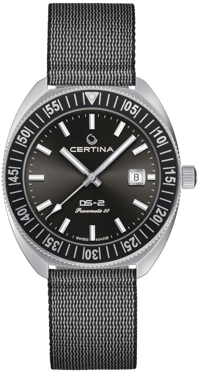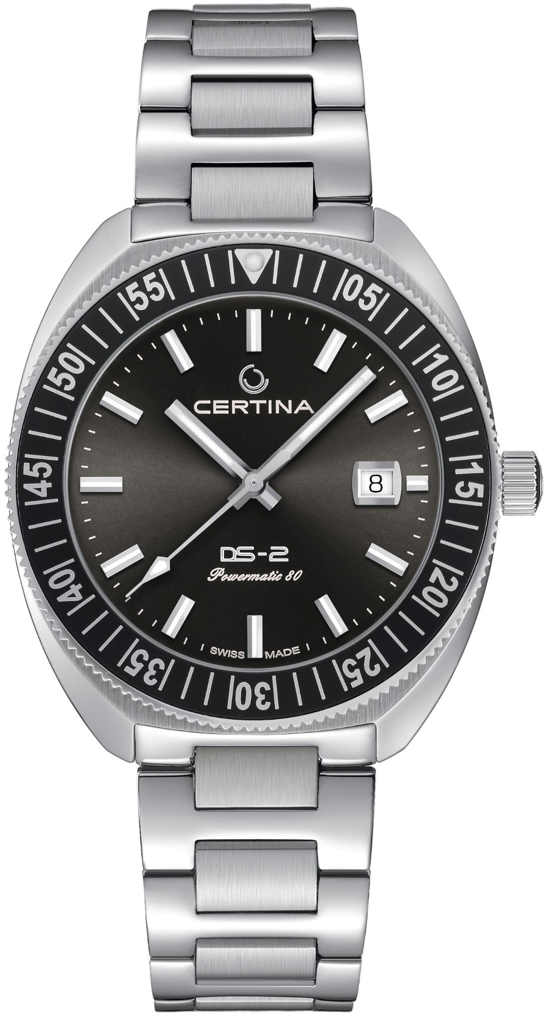 Certina DS-2 C024.607.11.081.02 sú pánske automatické hodinky na kovovom náramku v kombinácii brusu a lesku s motýlikovou sponou, ktoré nadväzujú na populárny spoľahlivý model DS-2 z roku 1968. Puzdro z nerezovej ocele v tvare „tonneau“, elipsy zakončené na oboch koncoch, má priemer 41,1 milimetra, otočnú lunetu s hliníkovou vložkou s minútovou stupnicou a priehľadné viečko. Antracitový číselník s efektom slnečného brusu a indikáciou dátumu je chránený klenutým zafírovým sklom s antireflexnou vrstvou. Vintage charakter hodiniek zdôrazňujú hranaté ručičky a hodinové indexy pokryté luminiscenčným náterom Super-LumiNova®, ktorý garantuje perfektnú čitateľnosť za zhoršených svetelných podmienok. Pohon hodiniek zaisťuje mechanický strojček Powermatic 80.611 s automatickým náťahom a rezervou chodu približne 80 hodín. Kaliber je vybavený vláskom zotrvačky Nivachron™, čo je špeciálny antimagnetický materiál, vďaka ktorému sú hodinky veľmi odolné voči magnetickým poliam. Tento strojček s funkciou hackingu je možné v prípade potreby naťahovať aj ručne pomocou skrutkovacej korunky. Model disponuje technológiou DS (Double Security) používanou a zdokonaľovanou už od roku 1959, vďaka ktorej majú hodinky zvýšenú odolnosť voči nárazom a vode. Vodotesnosť hodiniek robí 20 ATM a sú vhodnou voľbou na šnorchlovanie a potápanie. Súčasťou balenia je náhradný šedo-čierny textilný remienok z materiálu #tide ocean – recyklovaného plastu vyloveného z mora.