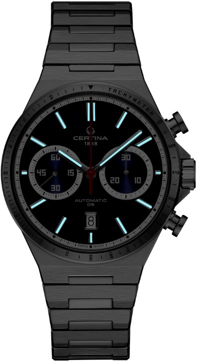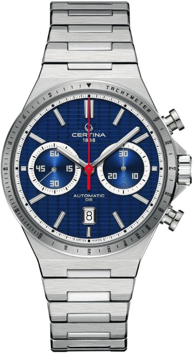 Certina DS-7 Chrono Auto C043.427.11.041.00 sú pánske automatické hodinky na oceľovom náramku s motýlikovou sponou. Puzdro z nerezovej ocele má priemer 42 milimetrov, priehľadné viečko a lunetu s tachymetrickou stupnicou. Modrý štruktúrovaný číselník s chronografom a indikáciou dáta je chránený odolným zafírovým sklom s antireflexnou vrstvou. Aplikované hodinové indexy sú rovnako ako ručičky pokryté luminiscenčným náterom Super-LumiNova®, ktorý garantuje perfektnú čitateľnosť za zhoršených svetelných podmienok. Pohon hodiniek zaisťuje mechanický strojček ETA Valjoux A05.231 s automatickým náťahom a rezervou chodu približne 68 hodín. Kaliber je vybavený kremíkovým vláskom zotrvačky, ktorý hodinkám prepožičiava vysokú rezistenciu voči magnetickým poliam. Tento strojček s funkciou hackingu je možné v prípade potreby naťahovať aj ručne pomocou signovanej korunky. Model disponuje technológiou DS (Double Security) používanou a zdokonaľovanou už od roku 1959, vďaka ktorej majú hodinky zvýšenú odolnosť voči nárazom a vode. Vodotesnosť hodiniek je 10 ATM a je teda vhodná na kúpanie alebo šnorchlovanie.
