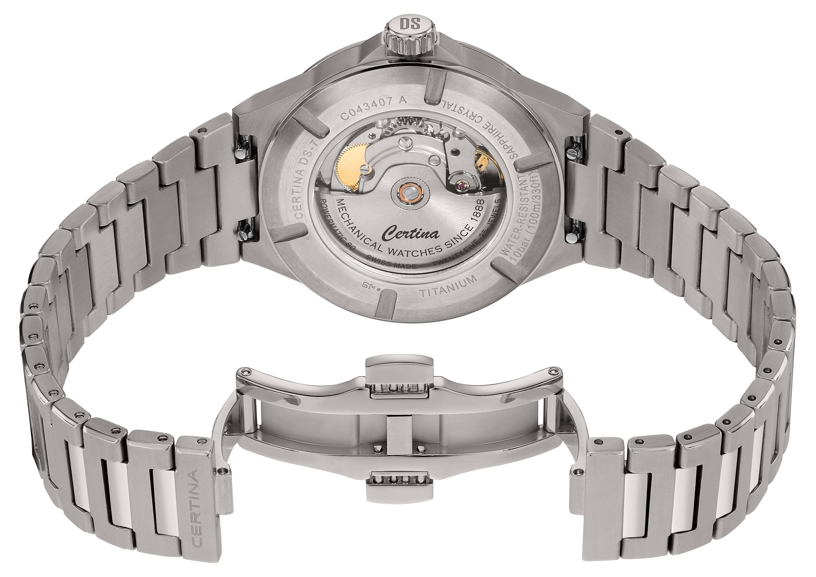 Certina DS-7 Powermatic 80 C043.407.44.041.00 sú pánske automatické hodinky na titánovom integrovanom náramku v kombinácii brusu a lesku s motýlikovou sponou. Puzdro z titánu má priemer 39 milimetrov a priehľadné viečko. Modrý číselník s efektom slnečného brusu a indikáciou dátumu je chránený odolným zafírovým sklom s antireflexnou vrstvou. Aplikované hodinové indexy sú rovnako ako ručičky pokryté luminiscenčným náterom Super-LumiNova®, ktorý garantuje perfektnú čitateľnosť za zhoršených svetelných podmienok. Pohon hodiniek zaisťuje mechanický strojček Powermatic 80.611 s automatickým náťahom a rezervou chodu približne 80 hodín, ktorý je vybavený vláskom zotrvačky Nivachron™, čo je špeciálny antimagnetický materiál, vďaka ktorému sú hodinky veľmi odolné voči magnetickým poliam. Tento strojček s funkciou hackingu je možné v prípade potreby naťahovať aj ručne pomocou signovanej korunky. Model disponuje technológiou DS (Double Security) používanou a zdokonaľovanou už od roku 1959, vďaka ktorej majú hodinky zvýšenú odolnosť voči nárazom a vode. Vodotesnosť hodiniek je 10 ATM a je teda vhodná na kúpanie alebo šnorchlovanie.
