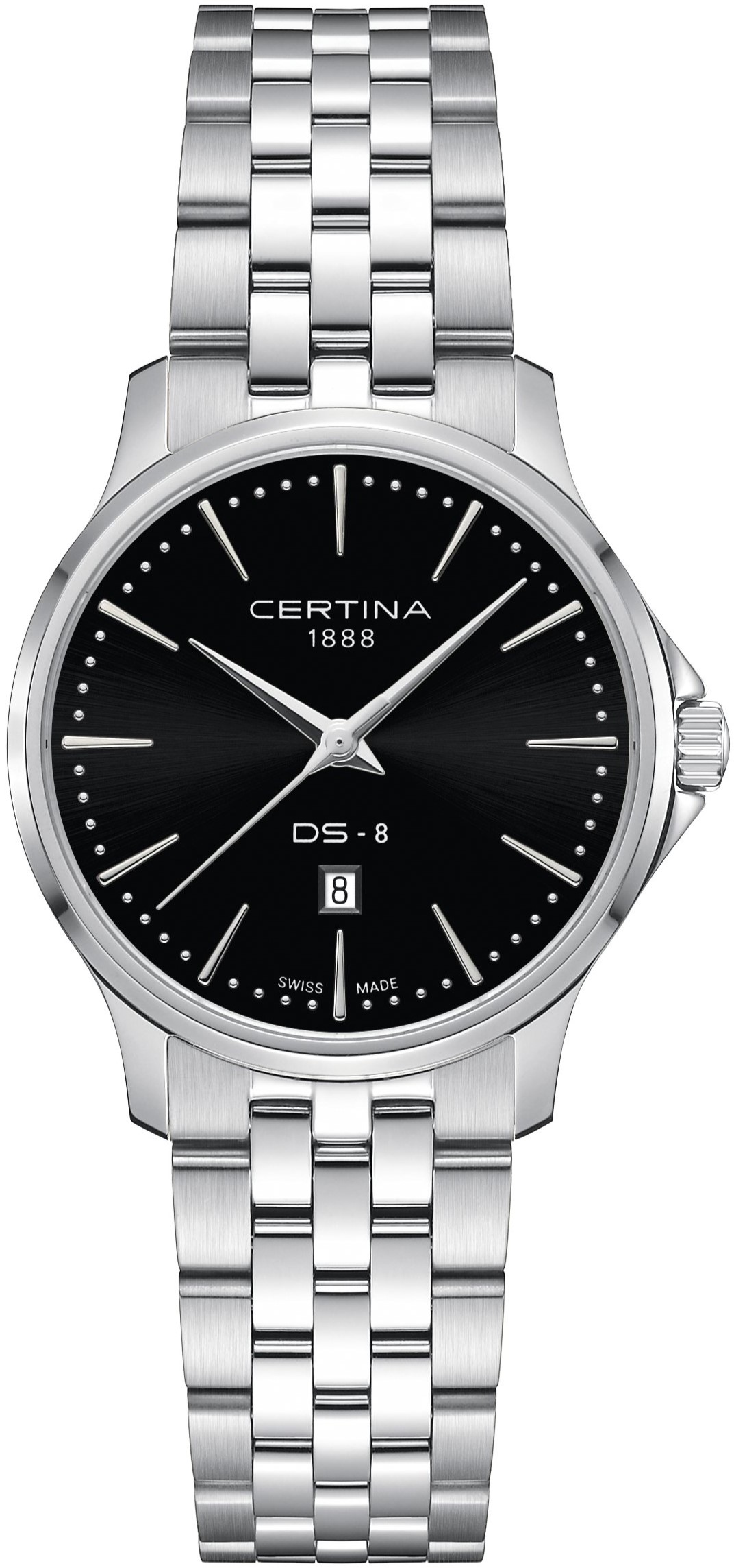 Certina DS-8 C045.010.11.051.00 sú dámske batériové hodinky na oceľovom náramku v kombinácii brusu a lesku s motýlikovou sponou. Puzdro z nerezovej ocele má priemer 31 milimetrov a viečko značené logom v tvare korytnačky, ktoré reprezentuje robustnosť a dlhú životnosť hodiniek Certina. Čierny číselník s indikáciou dáta je chránený odolným zafírovým sklom s antireflexnou vrstvou. Pohon hodiniek zaisťuje quartzový strojček ETA F03.412 s technológiou Precidrive s presnosťou +/- 10 sekúnd za rok a indikáciou slabej batérie. Model disponuje technológiou DS (Double Security) používanou a zdokonaľovanou už od roku 1959, vďaka ktorej majú hodinky zvýšenú odolnosť voči nárazom a vode. Vodotesnosť hodiniek je 10 ATM a sú teda vhodné na kúpanie alebo šnorchlovanie.
