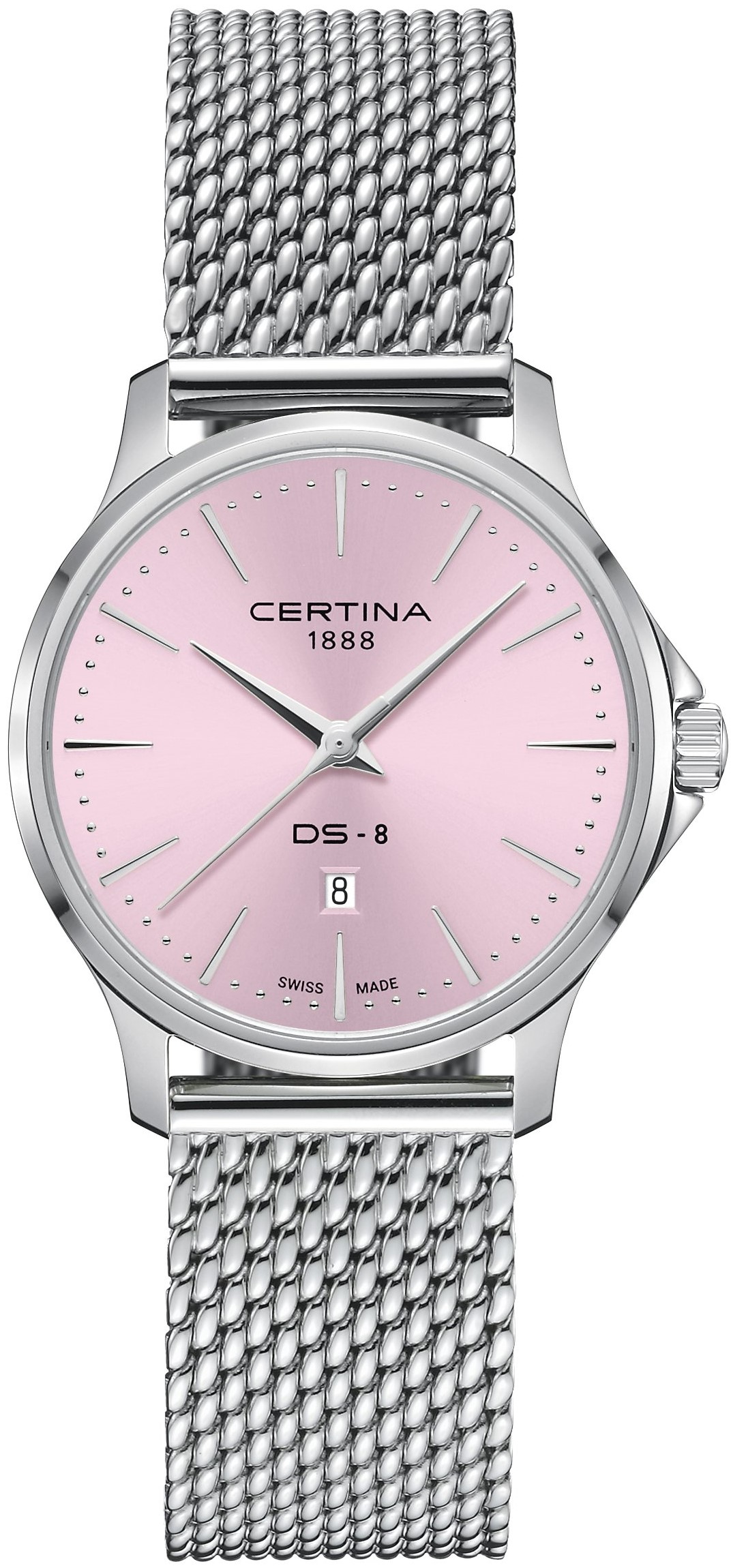 Certina DS-8 C045.010.11.331.00 sú dámske batériové hodinky na oceľovom milánskom ťahu s motýlikovou sponou. Puzdro z nerezovej ocele má priemer 31 milimetrov a viečko značené logom v tvare korytnačky, ktoré reprezentuje robustnosť a dlhú životnosť hodiniek Certina. Jemný ružový číselník s efektom slnečného brusu a indikáciou dátumu je chránený odolným zafírovým sklom s antireflexnou vrstvou. Pohon hodiniek zaisťuje quartzový strojček ETA F03.412 s technológiou Precidrive s presnosťou +/- 10 sekúnd za rok a indikáciou slabej batérie. Model disponuje technológiou DS (Double Security) používanou a zdokonaľovanou už od roku 1959, vďaka ktorej majú hodinky zvýšenú odolnosť voči nárazom a vode. Vodotesnosť hodiniek je 10 ATM a sú teda vhodné na kúpanie alebo šnorchlovanie.