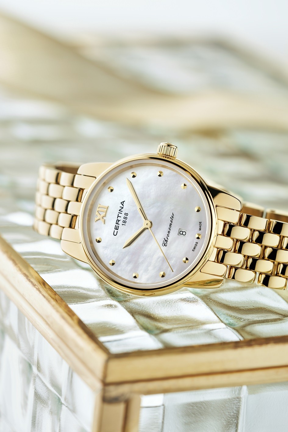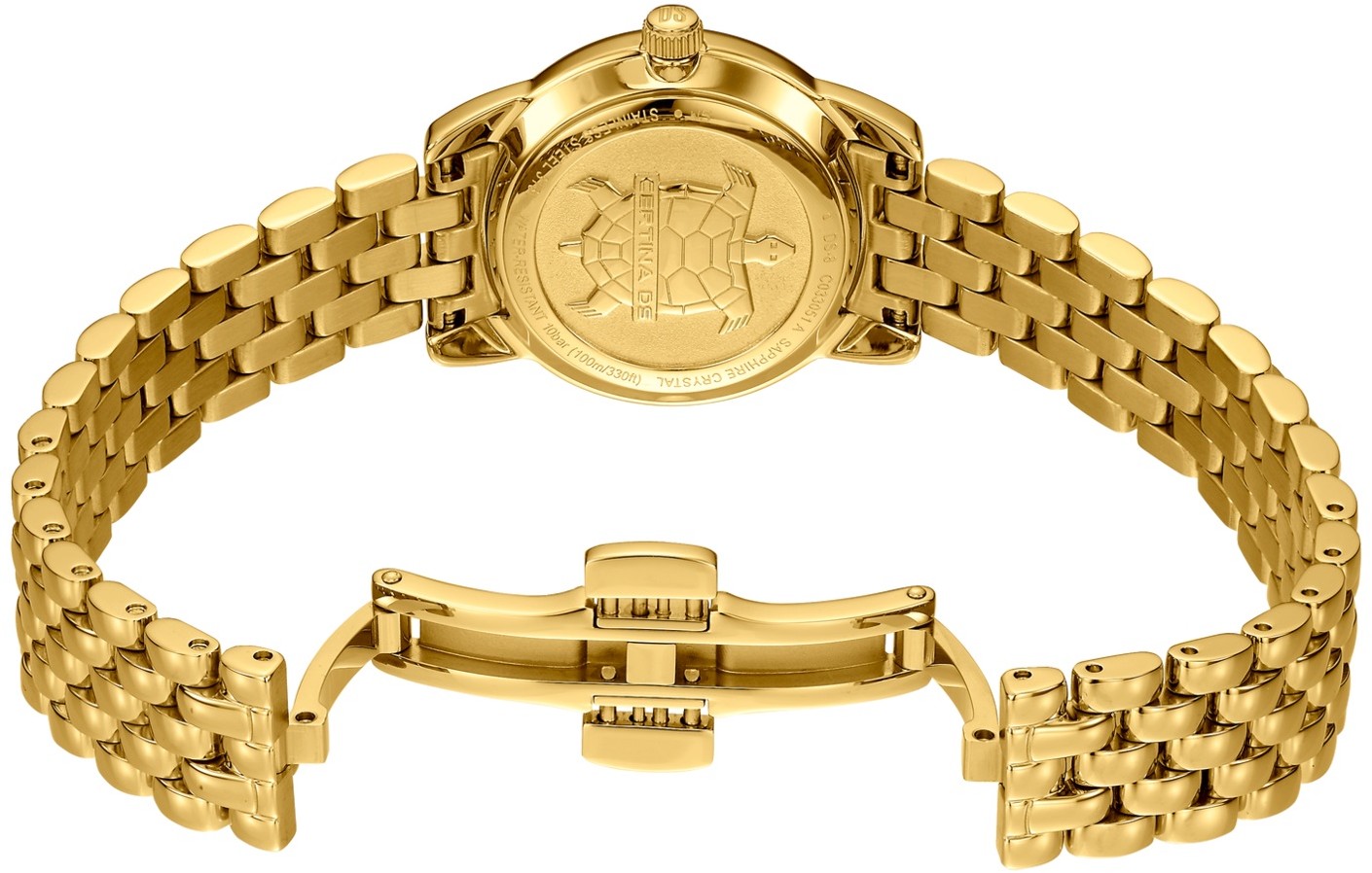 Certina DS-8 Lady C033.051.33.118.00 sú dámske batériové hodinky na kovovom náramku s PVD úpravou zlatej farby s motýlikovou sponou. Puzdro z nerezovej ocele v rovnakej farbe má priemer 27,5 milimetra a viečko značené logom v tvare korytnačky, ktoré reprezentuje robustnosť a dlhú životnosť hodiniek Certina. Perleťový číselník s indikáciou dátumu je chránený odolným zafírovým sklom s antireflexnou vrstvou a jeho krása vyniká najmä pod priamym svetlom, kedy môžeme pozorovať hru farieb perlete. Pohon hodiniek zaisťuje quartzový strojček ETA F03.412 s technológiou Precidrive s presnosťou +/- 10 sekúnd za rok a indikáciou slabej batérie. Hodinky s C.O.S.C. certifikáciou, ktorá je zárukou vysokej presnosti, nesú označenie „Chronometer“. Model disponuje technológiou DS (Double Security) používanou a zdokonaľovanou už od roku 1959, vďaka ktorej majú hodinky zvýšenú odolnosť voči nárazom a vode. Vodotesnosť hodiniek je 10 ATM a je teda vhodná na kúpanie alebo šnorchlovanie.
