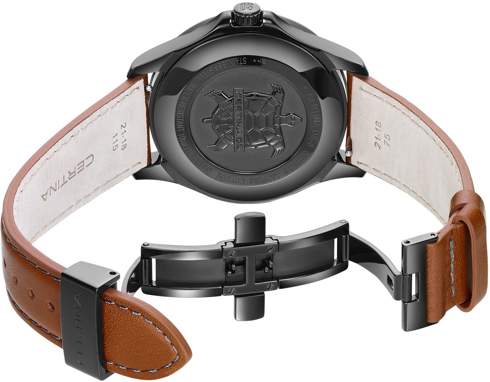 Certina DS-8 Quartz Precidrive Chronometer C033.851.36.057.00 sú pánske batériové hodinky na hnedom koženom remienku s motýlikovou sponou. Puzdro z nerezovej ocele s čiernou PVD úpravou má priemer 41 milimetrov, pevnú lunetu s čiernou hliníkovou vložkou s minútovou stupnicou a viečko značené logom v tvare korytnačky, ktoré reprezentuje robustnosť a dlhú životnosť hodiniek Certina. Čierny číselník s indikáciou dáta je chránený odolným zafírovým sklom s antireflexnou vrstvou. Aplikované hodinové indexy sú spolu s ručičkami pokryté luminiscenčným náterom Super-LumiNova®, ktorý garantuje perfektnú čitateľnosť za zhoršených svetelných podmienok. Pohon hodiniek zaisťuje quartzový strojček ETA F07.412 s technológiou Precidrive s presnosťou +/- 10 sekúnd za rok a indikáciou slabej batérie. Hodinky s C.O.S.C. certifikáciou, ktorá je zárukou vysokej presnosti, nesú označenie „Chronometer“. Model disponuje technológiou DS (Double Security) používanou a zdokonaľovanou už od roku 1959, vďaka ktorej majú hodinky zvýšenú odolnosť voči nárazom a vode. Vodotesnosť hodiniek je 10 ATM a sú teda vhodné na kúpanie alebo šnorchlovanie.