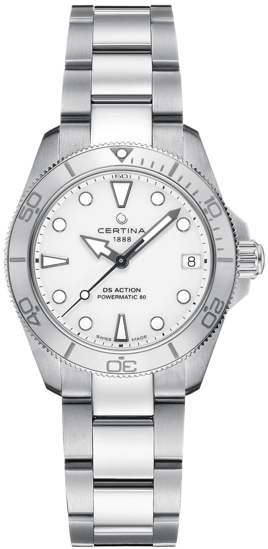 Certina DS Action Lady C032.007.11.011.00 sú dámske automatické hodinky na kovovom náramku s motýlikovou sponou. Puzdro z nerezovej ocele má priemer 34,5 milimetra, jednosmerne otočnú lunetu s keramickou vložkou s potápačskou stupnicou a viečko značené logom v tvare korytnačky, ktoré reprezentuje robustnosť a dlhú životnosť hodiniek Certina. Biely číselník s indikáciou dáta je chránený odolným zafírovým sklom s antireflexnou vrstvou. Aplikované hodinové indexy aj ručičky sú pokryté luminiscenčným náterom Super-LumiNova®, ktorý garantuje perfektnú čitateľnosť za zhoršených svetelných podmienok. Pohon hodiniek zaisťuje mechanický strojček Powermatic 80.611 s automatickým náťahom a rezervou chodu približne 80 hodín. Kaliber je vybavený vláskom zotrvačky Nivachron, čo je špeciálny antimagnetický materiál, vďaka ktorému sú hodinky veľmi odolné voči magnetickým poliam. Tento strojček s funkciou hackingu je možné v prípade potreby naťahovať aj ručne pomocou skrutkovacej korunky. Model disponuje technológiou DS (Double Security) používanou a zdokonaľovanou už od roku 1959, vďaka ktorej majú hodinky zvýšenú odolnosť voči nárazom a vode. Vodotesnosť hodiniek je 30 ATM a s certifikáciou ISO 6425 sú vhodnou voľbou pre prístrojové potápanie.