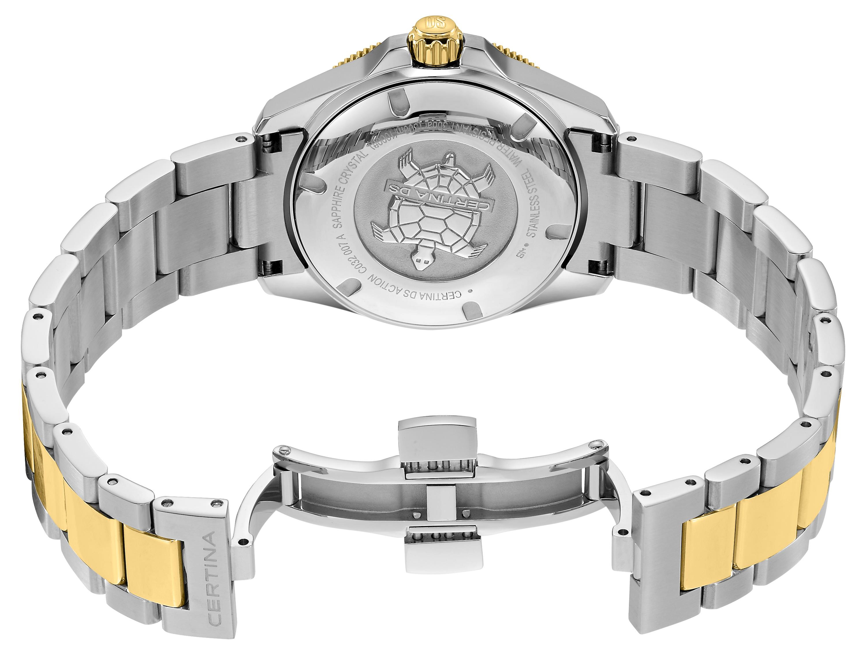 Certina DS Action Lady C032.007.22.116.00 sú dámske automatické hodinky na kovovom bicolor náramku s motýlikovou sponou. Puzdro z nerezovej ocele má priemer 34,5 milimetra a viečko značené logom v tvare korytnačky, ktoré reprezentuje robustnosť a dlhú životnosť hodiniek Certina. Hodinky sú vybavené jednosmerne otočnou lunetou v zlatej povrchovej PVD úprave s keramickou vložkou s potápačskou stupnicou. Perleťový číselník s 8 diamantmi a indikáciou dátumu je chránený odolným zafírovým sklom s antireflexnou vrstvou a jeho krása vyniká najmä pod priamym svetlom, kedy môžeme pozorovať hru farieb perlete. Aplikované hodinové indexy aj ručičky v zlatej farbe sú pokryté luminiscenčným náterom Super-LumiNova®, ktorý garantuje perfektnú čitateľnosť za zhoršených svetelných podmienok. Pohon hodiniek zaisťuje mechanický strojček Powermatic 80.611 s automatickým náťahom a rezervou chodu približne 80 hodín. Kaliber je vybavený vláskom zotrvačky Nivachron, čo je špeciálny antimagnetický materiál, vďaka ktorému sú hodinky veľmi odolné voči magnetickým poliam. Tento strojček s funkciou hackingu je možné v prípade potreby naťahovať aj ručne pomocou skrutkovacej korunky. Model disponuje technológiou DS (Double Security) používanou a zdokonaľovanou už od roku 1959, vďaka ktorej majú hodinky zvýšenú odolnosť voči nárazom a vode. Vodotesnosť hodiniek je 30 ATM a s certifikáciou ISO 6425 sú vhodnou voľbou pre prístrojové potápanie.