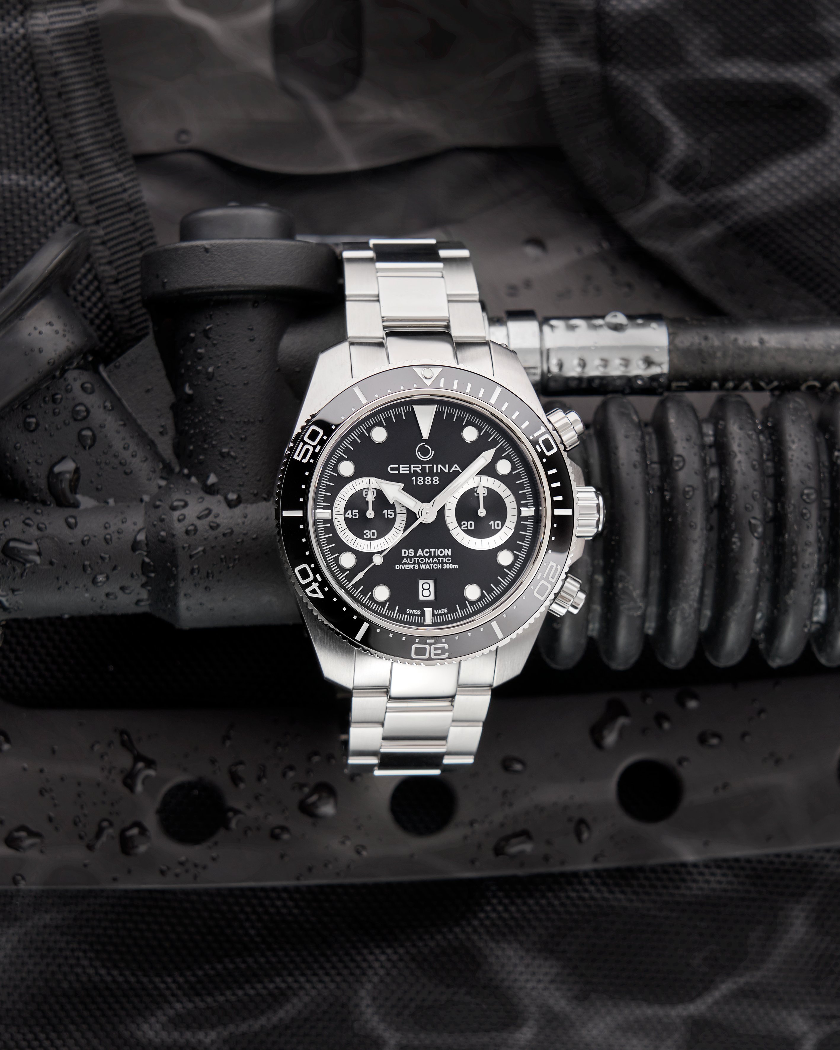 Certina DS Action Diver Chrono C032.827.11.051.00 sú pánske športové automatické hodinky na oceľovom náramku v kombinácii brusu a lesku s preklápacou sponou. Puzdro z nerezovej ocele má priemer 44,6 milimetra, skrutkovaciu korunku a jednosmerne otočnú lunetu s keramickou vložkou s minútovou stupnicou. Čierny číselník s indikáciou dátumu a funkciou chronografu je chránený odolným zafírovým sklom s antireflexnou vrstvou. Ručičky, indexy a časť lunety sú pokryté luminiscenčným náterom Super-LumiNova®, ktorý garantuje perfektnú čitateľnosť za zhoršených svetelných podmienok. Pohon hodiniek zaisťuje mechanický strojček ETA A05.231 s automatickým náťahom a rezervou chodu približne 68 hodín. Kaliber je vybavený kremíkovým vláskom zotrvačky, ktorý hodinkám prepožičiava vysokú rezistenciu voči magnetickým poliam. Tento strojček s funkciou hackingu je možné v prípade potreby naťahovať aj ručne pomocou signovanej korunky. Model disponuje technológiou DS (Double Security) používanou a zdokonaľovanou už od roku 1959, vďaka ktorej majú hodinky zvýšenú odolnosť voči nárazom a vode. Vodotesnosť hodiniek robí 30 ATM a sú tak vhodnou voľbou pre hlbinné potápanie.
