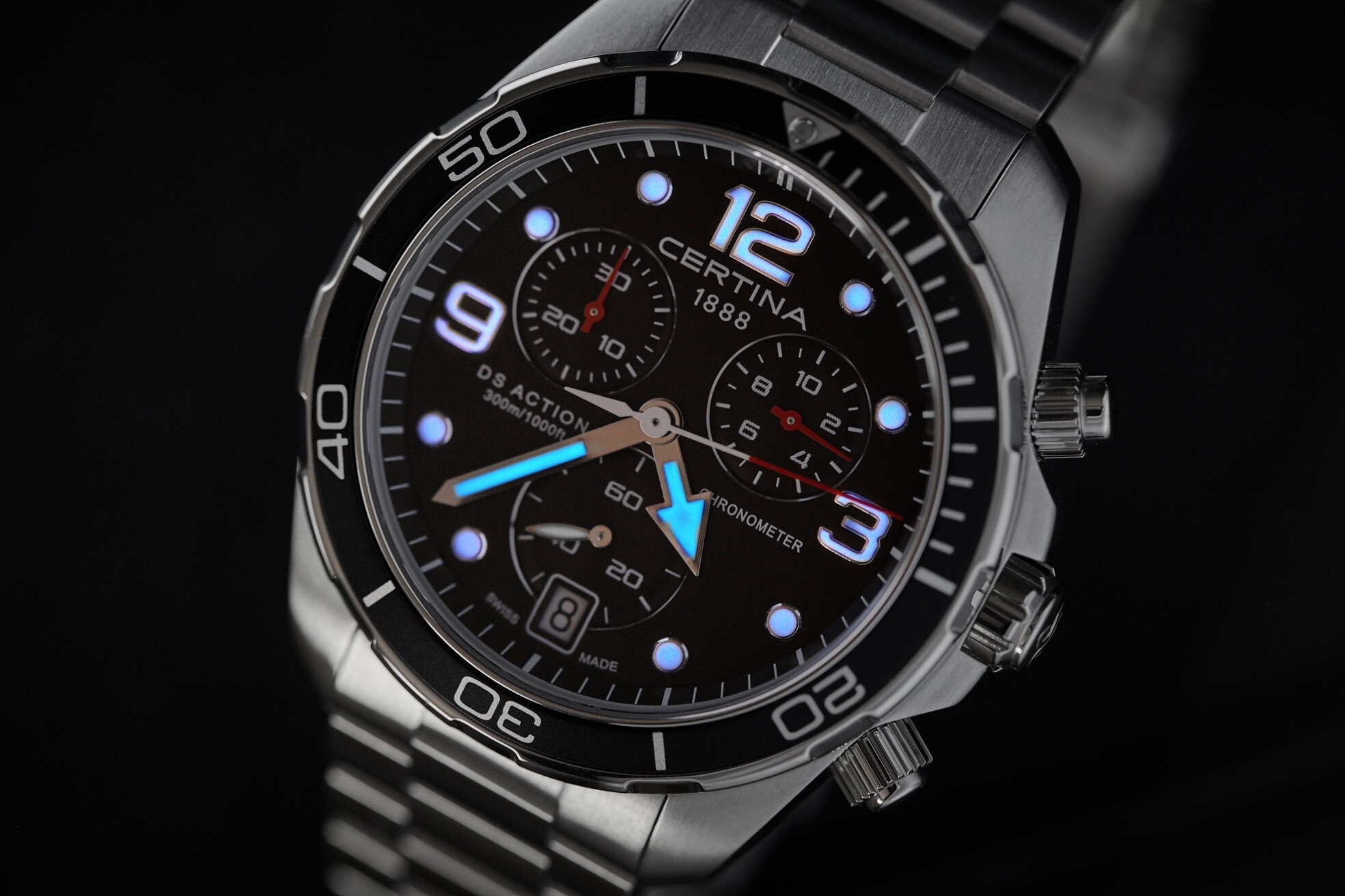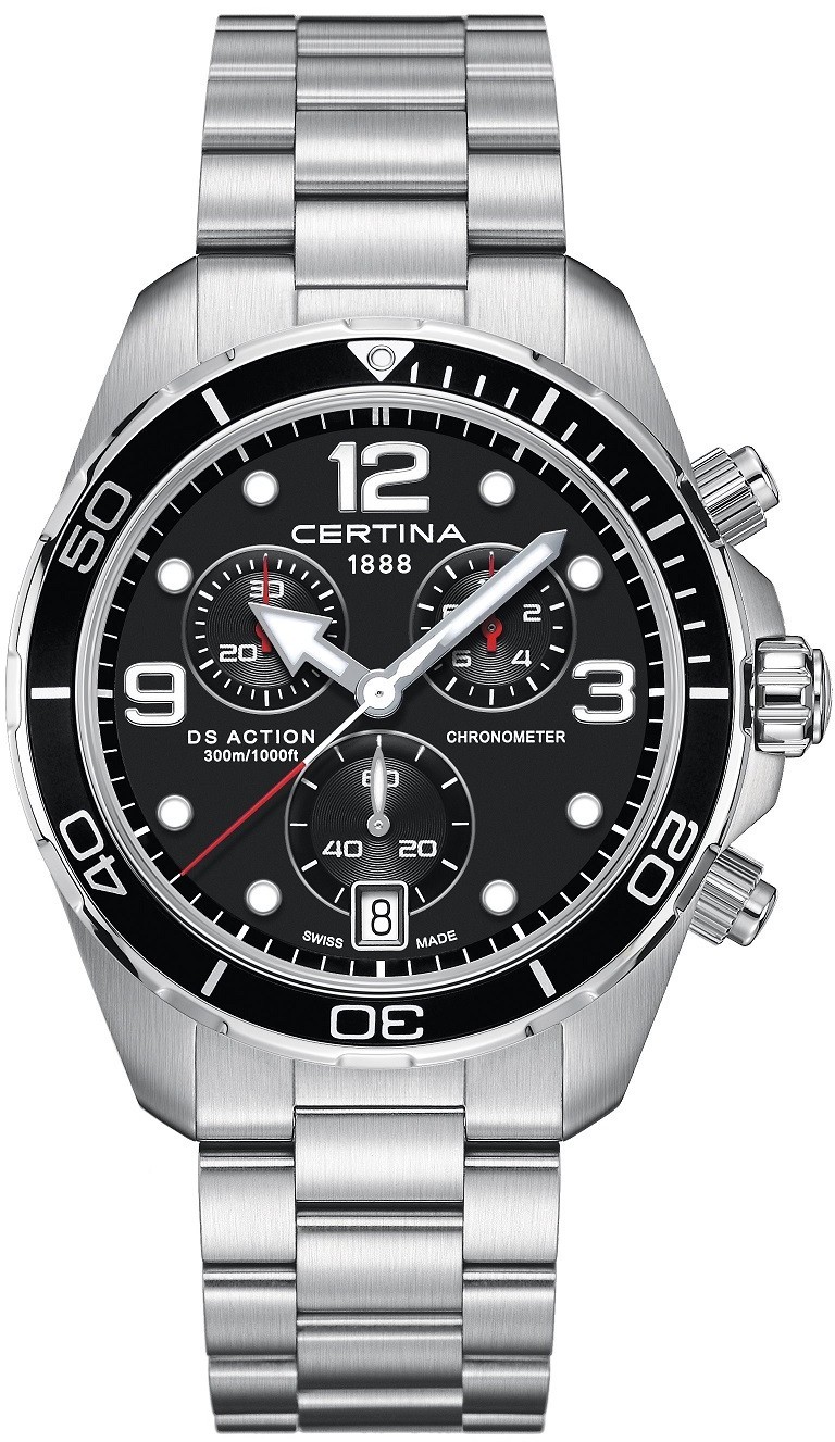 Certina DS Action Diver Chronometer C032.434.11.057.00 sú pánske batériové hodinky na oceľovom náramku s preklápacou sponou. Puzdro z nerezovej ocele v kombinácii brusu a lesku má priemer 43 milimetrov, skrutkovaciu korunku, jednosmerne otočnú lunetu s hliníkovou vložkou s potápačskou stupnicou a viečko značené logom v tvare korytnačky, ktoré reprezentuje robustnosť a dlhú životnosť hodiniek Certina. Čierny číselník s indikáciou dátumu a funkciou chronografu je chránený odolným zafírovým sklom s antireflexnou vrstvou. Aplikované hodinové indexy sú s ručičkami pokryté luminiscenčným náterom Super-LumiNova®, ktorý garantuje perfektnú čitateľnosť za zhoršených svetelných podmienok. Pohon hodiniek zaisťuje spoľahlivý quartzový strojček ETA G10.212 s technológiou Precidrive s presnosťou +/- 10 sekúnd za rok a indikáciou slabej batérie. Hodinky s C.O.S.C. certifikáciou, ktorá je zárukou vysokej presnosti, nesú označenie „Chronometer“. Model disponuje technológiou DS (Double Security) používanou a zdokonaľovanou už od roku 1959, vďaka ktorej majú hodinky zvýšenú odolnosť voči nárazom a vode. Vodotesnosť hodiniek robí 30 ATM a sú tak vhodnou voľbou na šnorchlovanie a hlbinné potápanie.