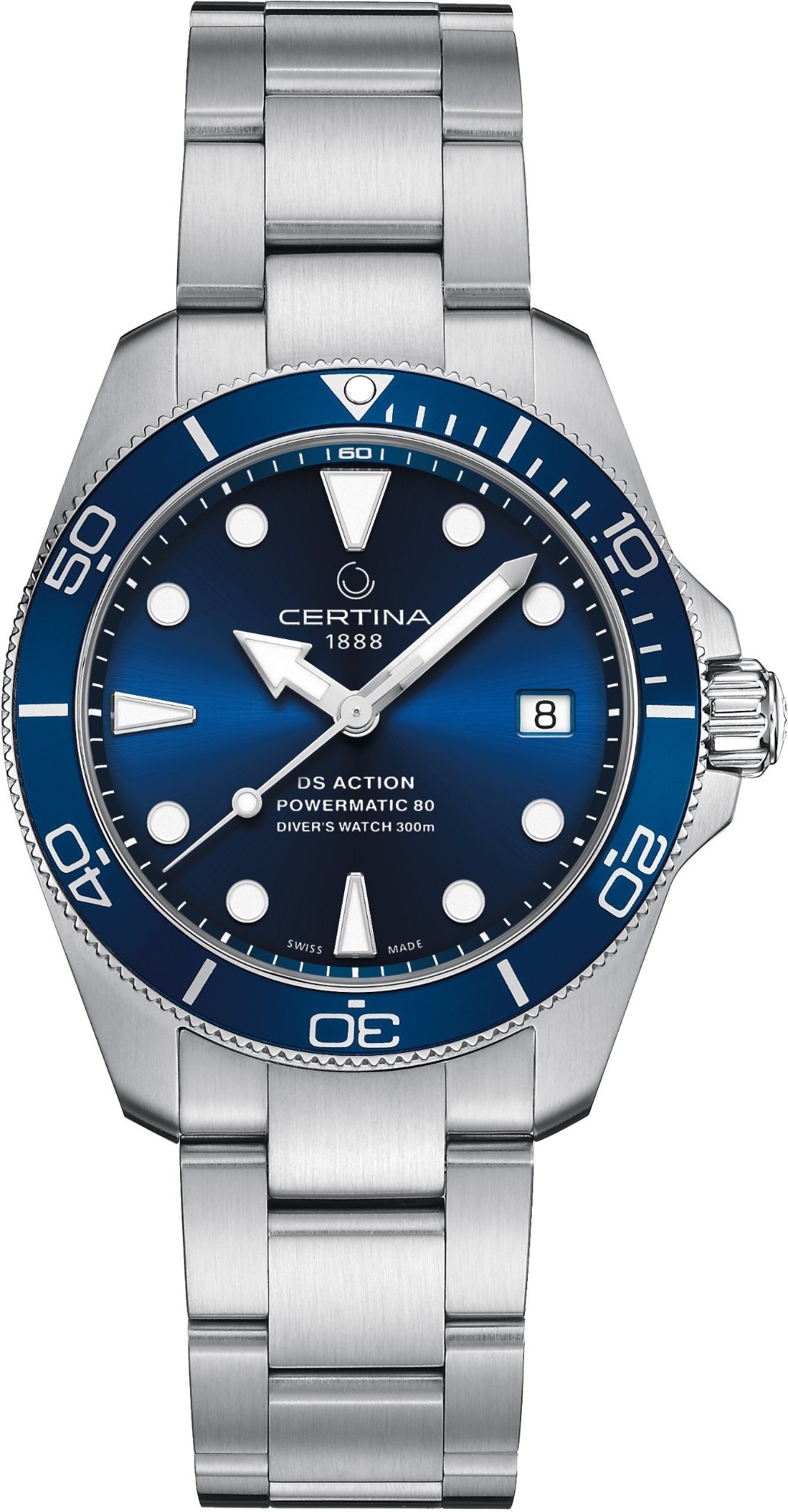 Certina DS Action Diver Powermatic 80 C032.807.11.041.00 sú automatické hodinky na kovovom náramku s preklápacou sponou. Puzdro z nerezovej ocele má priemer 38 milimetrov, jednosmerne otočnú lunetu s hliníkovou vložkou s potápačskou stupnicou a viečko značené logom v tvare korytnačky, ktoré reprezentuje robustnosť a dlhú životnosť hodiniek Certina. Modrý číselník s efektom slnečného brusu a indikáciou dátumu je chránený odolným zafírovým sklom s antireflexnou vrstvou. Aplikované hodinové indexy sú spolu s ručičkami pokryté luminiscenčným náterom Super-LumiNova®, ktorý garantuje perfektnú čitateľnosť za zhoršených svetelných podmienok. Pohon hodiniek zaisťuje mechanický strojček Powermatic 80.611 s automatickým náťahom a rezervou chodu približne 80 hodín. Kaliber je vybavený vláskom zotrvačky Nivachron, čo je špeciálny antimagnetický materiál, vďaka ktorému sú hodinky veľmi odolné voči magnetickým poliam. Tento strojček s funkciou hackingu je možné v prípade potreby naťahovať aj ručne pomocou skrutkovacej korunky. Model disponuje technológiou DS (Double Security) používanou a zdokonaľovanou už od roku 1959, vďaka ktorej majú hodinky zvýšenú odolnosť voči nárazom a vode. Vodotesnosť hodiniek je 30 ATM a s certifikáciou ISO 6425 sú vhodnou voľbou pre prístrojové potápanie.